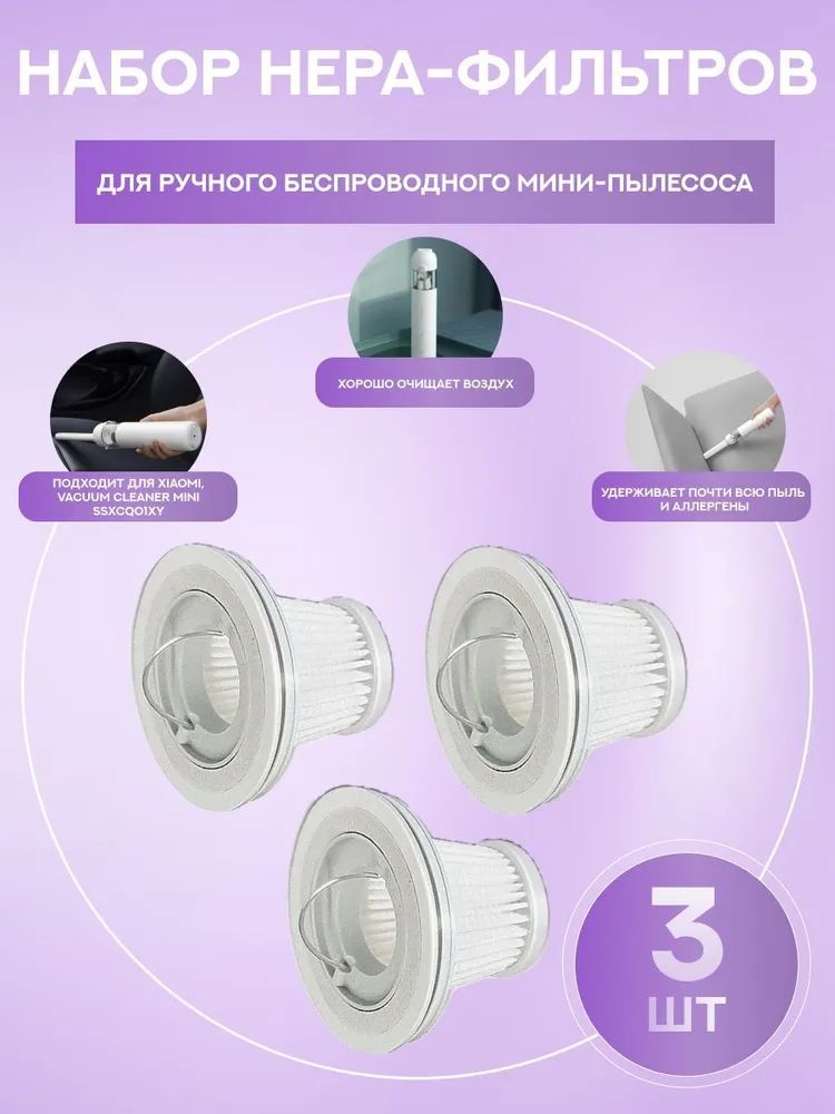 Для Xiaomi, Mijia ручного беспроводного мини-пылесоса, моющийся/vacuum cleaner mini SSXCQ01XY : Фильтр НЕРА (комплект 3 штуки)
