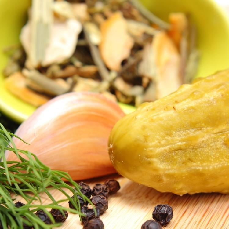гвоздика, горчичное семя, кориандр, лук, лавровый лист, можжевельник, морковь, перец душистый, перец чили, укроп зелень.