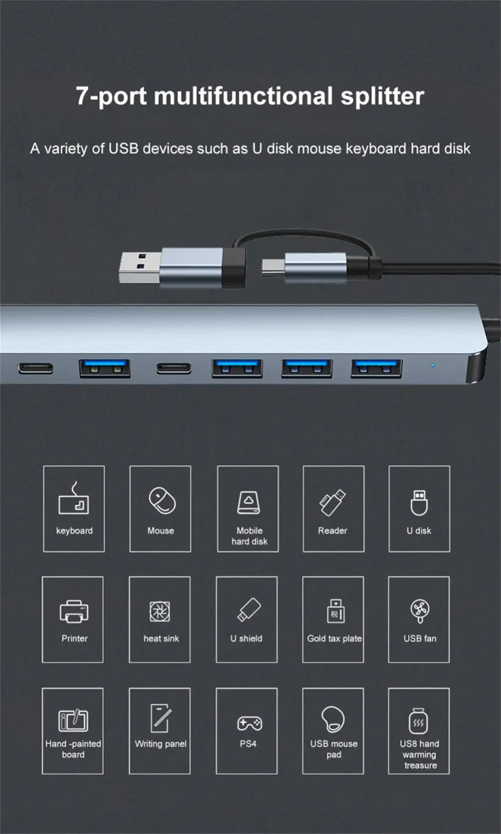 1.USB-концентратор полностью алюминиевый корпус. Прекрасное мастерство, прочный металлический корпус защищает от поломки и более прочный, чем пластик.