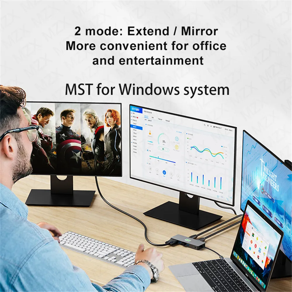 Для Macbook Mac IOS система не поддерживает MST (расширенные мониторы могут отображать только один и тот же контент, но он может отличаться от самого экрана ноутбука);Док-станция MZX 11 в 1 USB-концентратор 3,2 MST HDMl DP 4K 60 Гц VGA 1000M Расширение RJ45 Tipo C USB-C Тип PD100W Док-концентратор