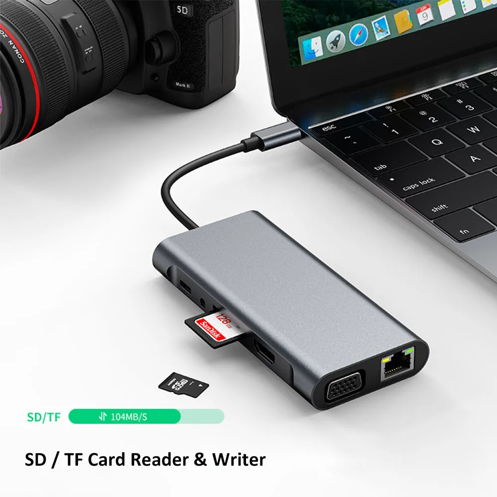 11 in 1 Docking Stations USB Hub USB3.0,USB2.0*3,RJ45,VGA,HDMI,TF,SD,Audio,PD