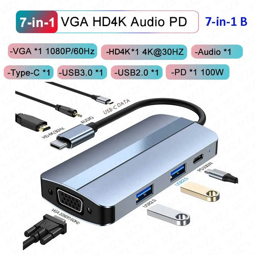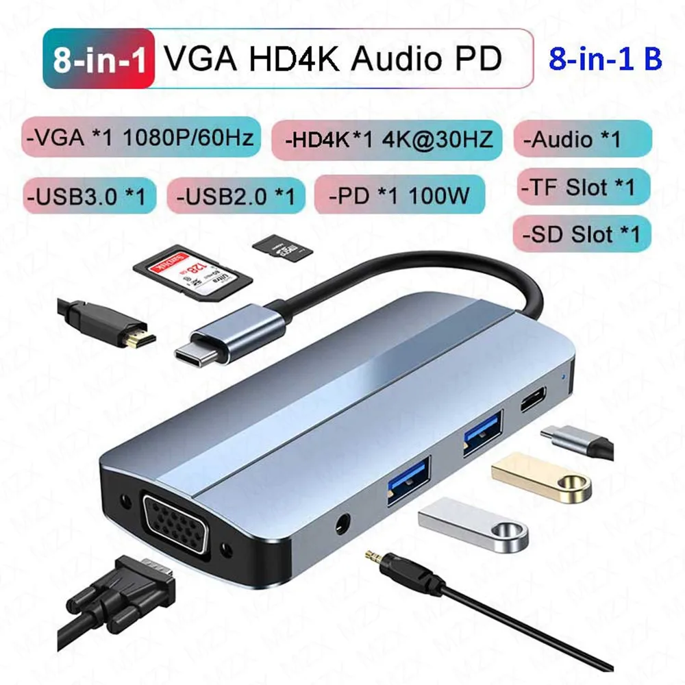 Док-станция MZX USB-концентратор-сплиттер Тип C 3 0 3,0 Адаптер 4K HDMI-совместимый VGA Мультиконцентратор-концентратор SD PD Расширение 100 Вт
