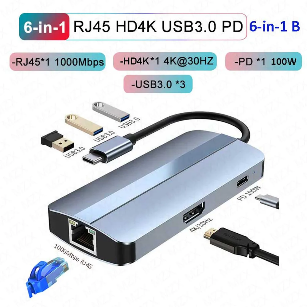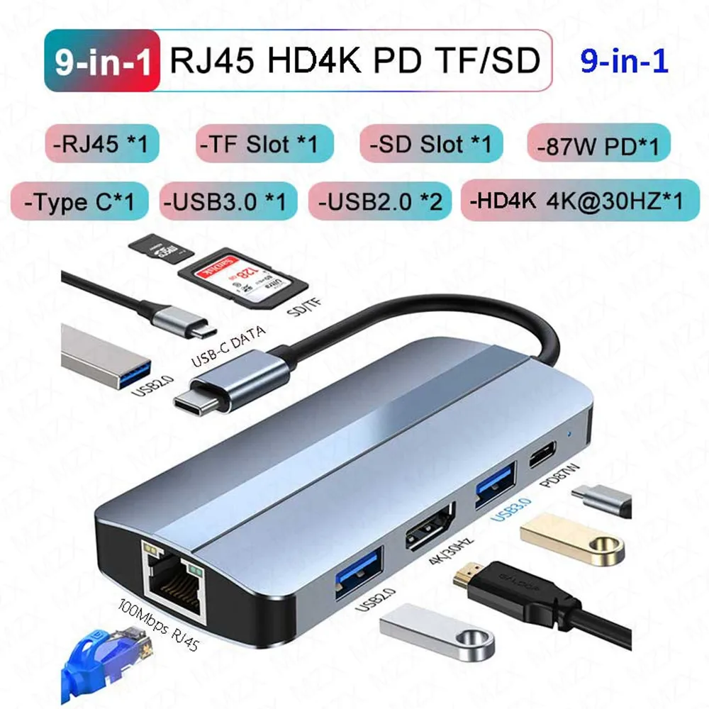 Док-станция MZX USB-концентратор разветвитель Тип C 3 0 3,0 адаптер 4K HDMI-совместимый VGA многоконцентратор SD PD 100 Вт расширение USBC HD расширитель расширить 100 Мбит/с RJ45 Ethernet сеть SD TF кард-ридер мобильный сотовый телефон Смартфон компьютер ноутбук аксессуары для ПК USB-C Расширитель передачи данных несколько портов для Macbook Pro Air Thunderbolt 3 4
