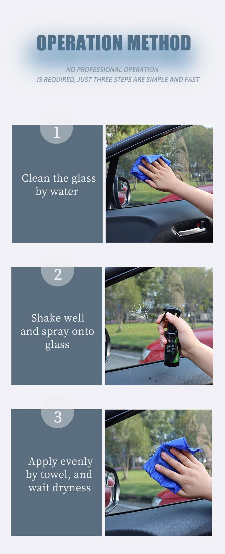 Простота в использовании: не беспокойтесь о сложных методах использования и не беспокойтесь о том, чтобы оставить водные полосы, просто распылите и протрите.