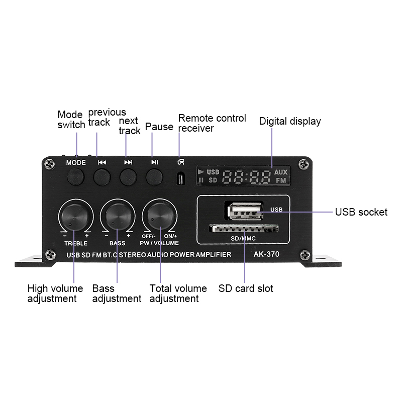 * TF-карта, AUX, U-диск, воспроизведение в формате MP3, поддержка беспроводного подключения Bluetooth.