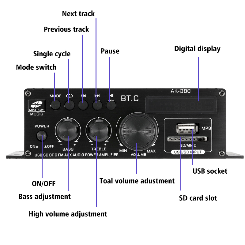 * TF-карта, AUX, U-диск, воспроизведение в формате MP3, поддержка беспроводного подключения Bluetooth.