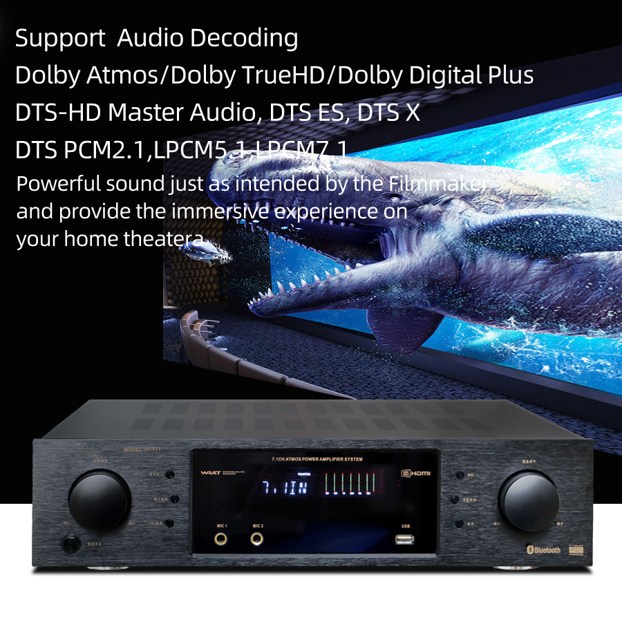 Поддержка Dolby Atmos/Dolby TrueHD/Dolby Digital Plus/DTS X/DTS-HD/DTS PCM2.1,LPCM5.1,LPCM7.1. Обновите свой домашний кинотеатр с помощью AV777 обеспечивает действительно захватывающий 3D-звук, наслаждайтесь бесшовной совместимостью с новейшими телевизорами HD и Ultra HD, Blu-Ray проигрывателями и игровыми консолями.