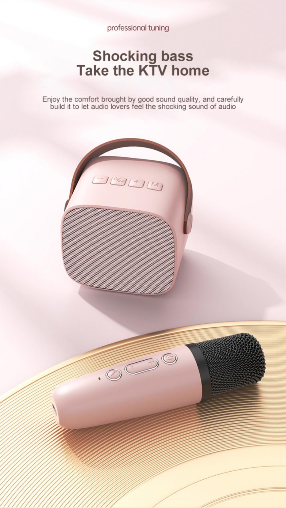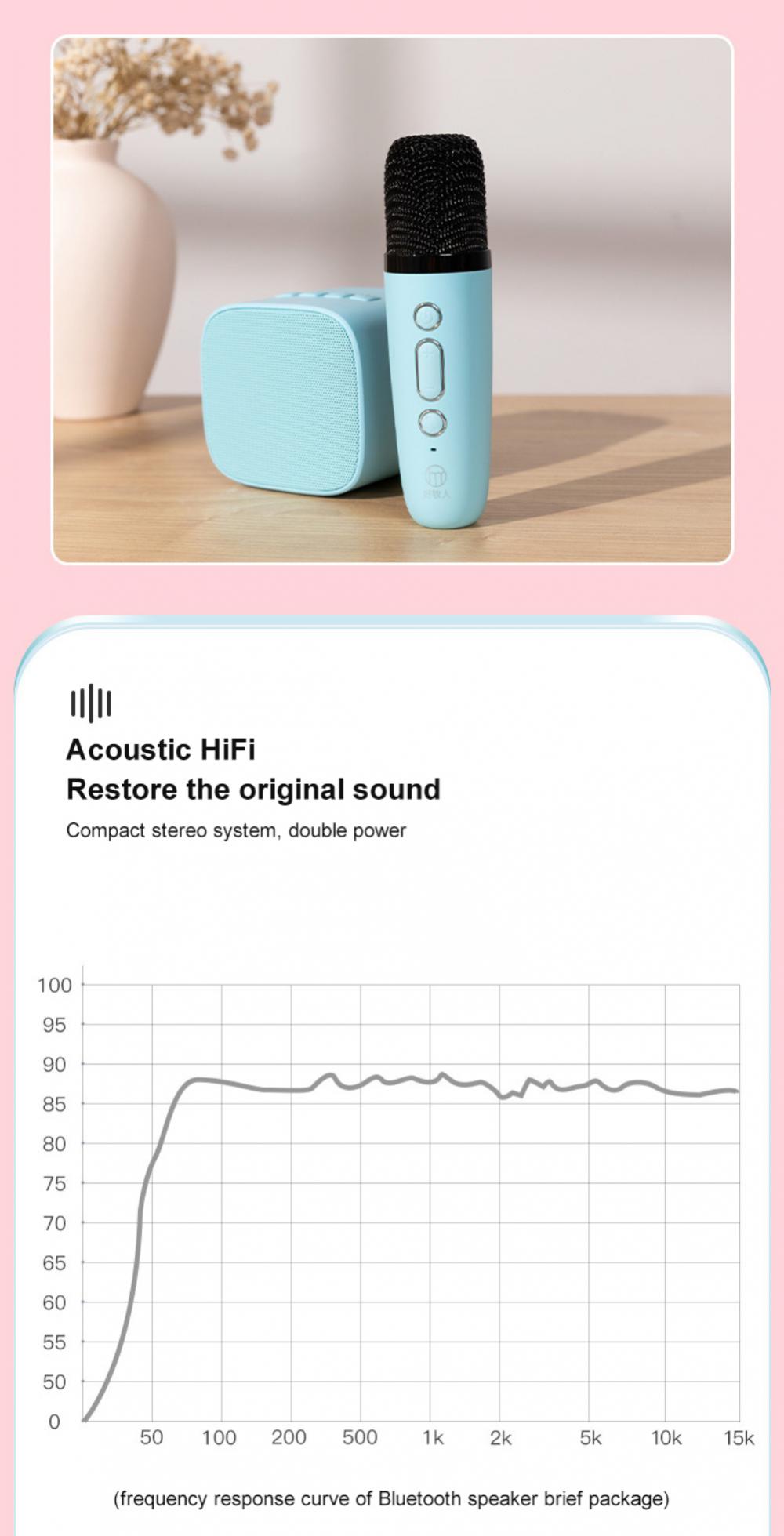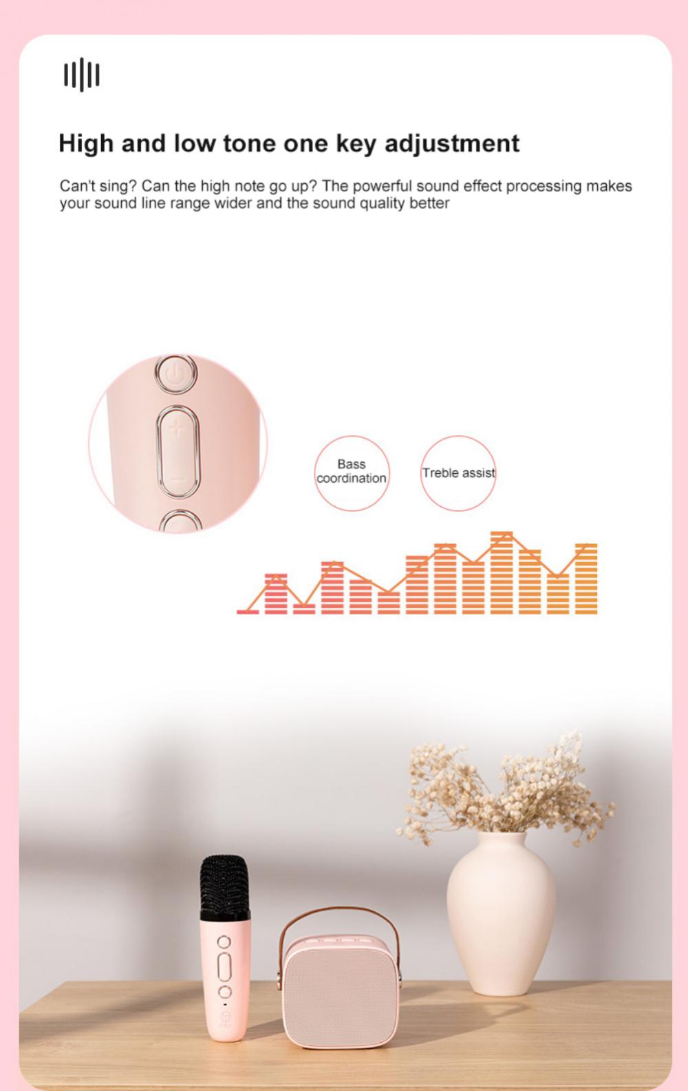 Мини-караоке-машина со стильным внешним видом и простым управлением для детей и взрослых. Динамик Bluetooth оснащен высокопроизводительным аудиодрайвером и усовершенствованным цифровым сигнальным процессором, которые делают звук более четким и позволяют избежать раздражающей обратной связи с микрофоном.
