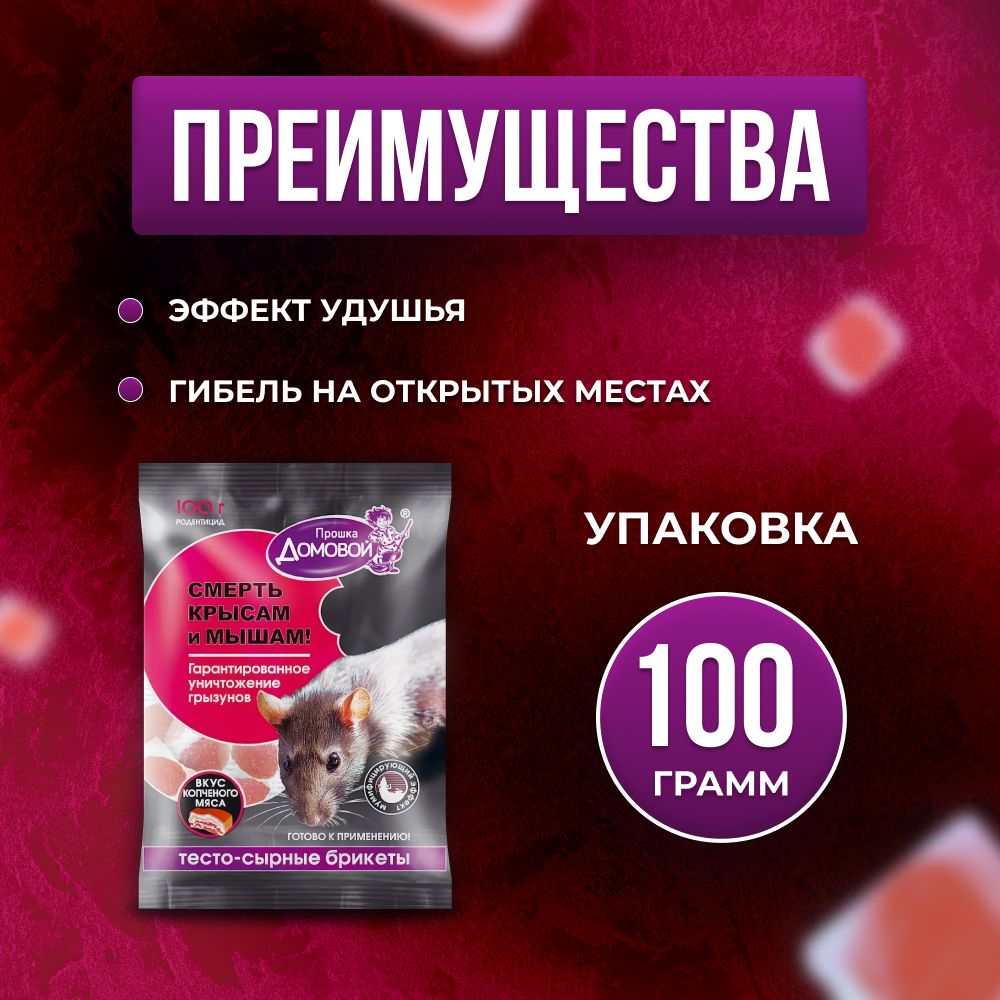 Описание: Вы хотите избавиться от грызунов на вашей даче или в доме? Устали от бесконечной борьбы с назойливыми крысами и мышами? Предлагаем вам средство, которое навсегда решит вашу проблему - Тесто-брикеты Домовой, мумифицирующая отрава от мышей и крыс.