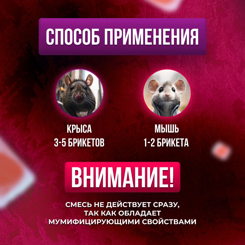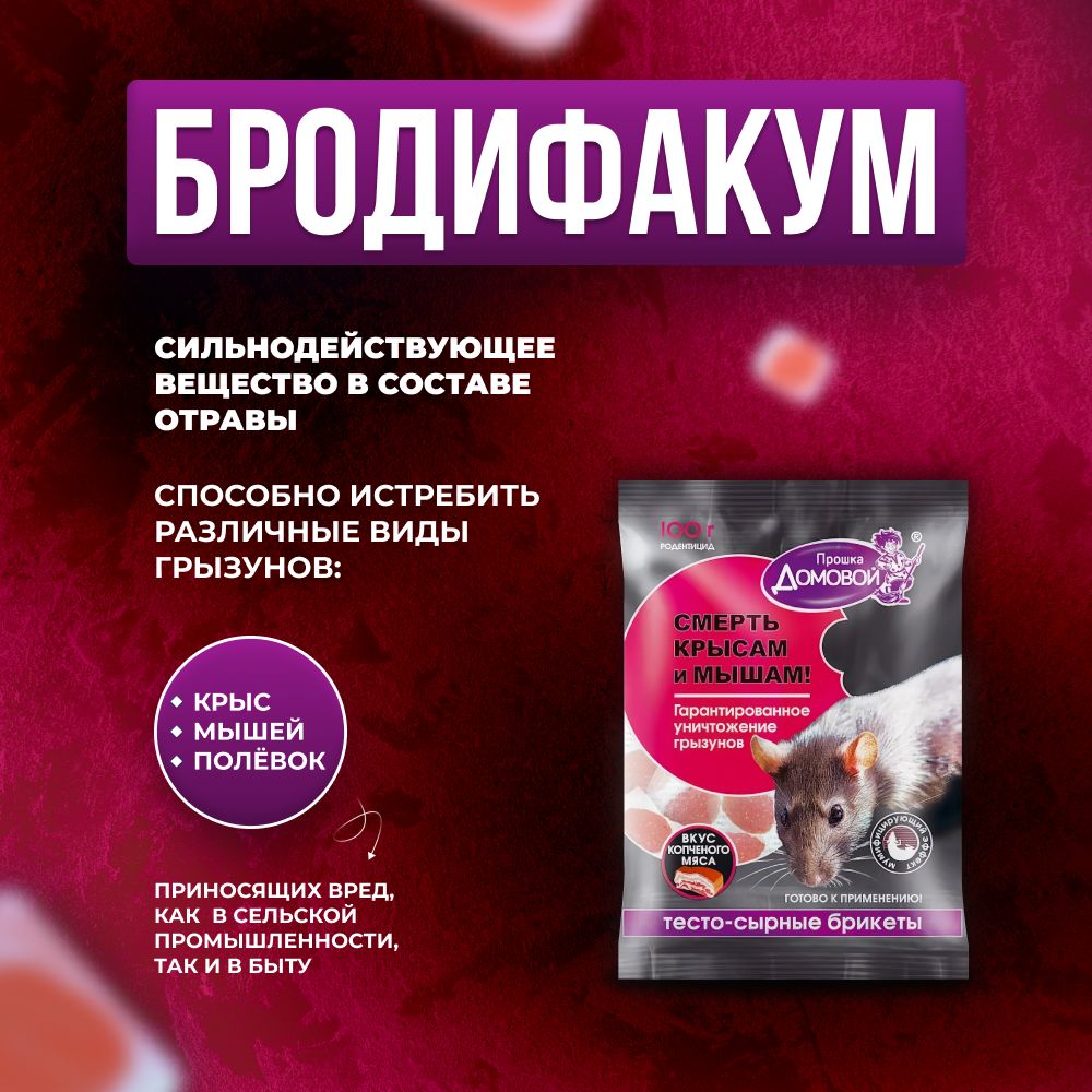 Истребитель грызунов - это не просто отрава от мышей и крыс, это полноценное решение вашей проблемы. Она эффективно работает даже в самых сложных условиях, обеспечивая полное уничтожение грызунов и предотвращая их повторное появление. Не откладывайте решение проблемы на потом! Закажите Брикеты Домовой прямо сейчас и наслаждайтесь своим домом или дачей без грызунов. Будьте уверены, что с нашим товаром вы навсегда избавитесь от назойливых грызунов!