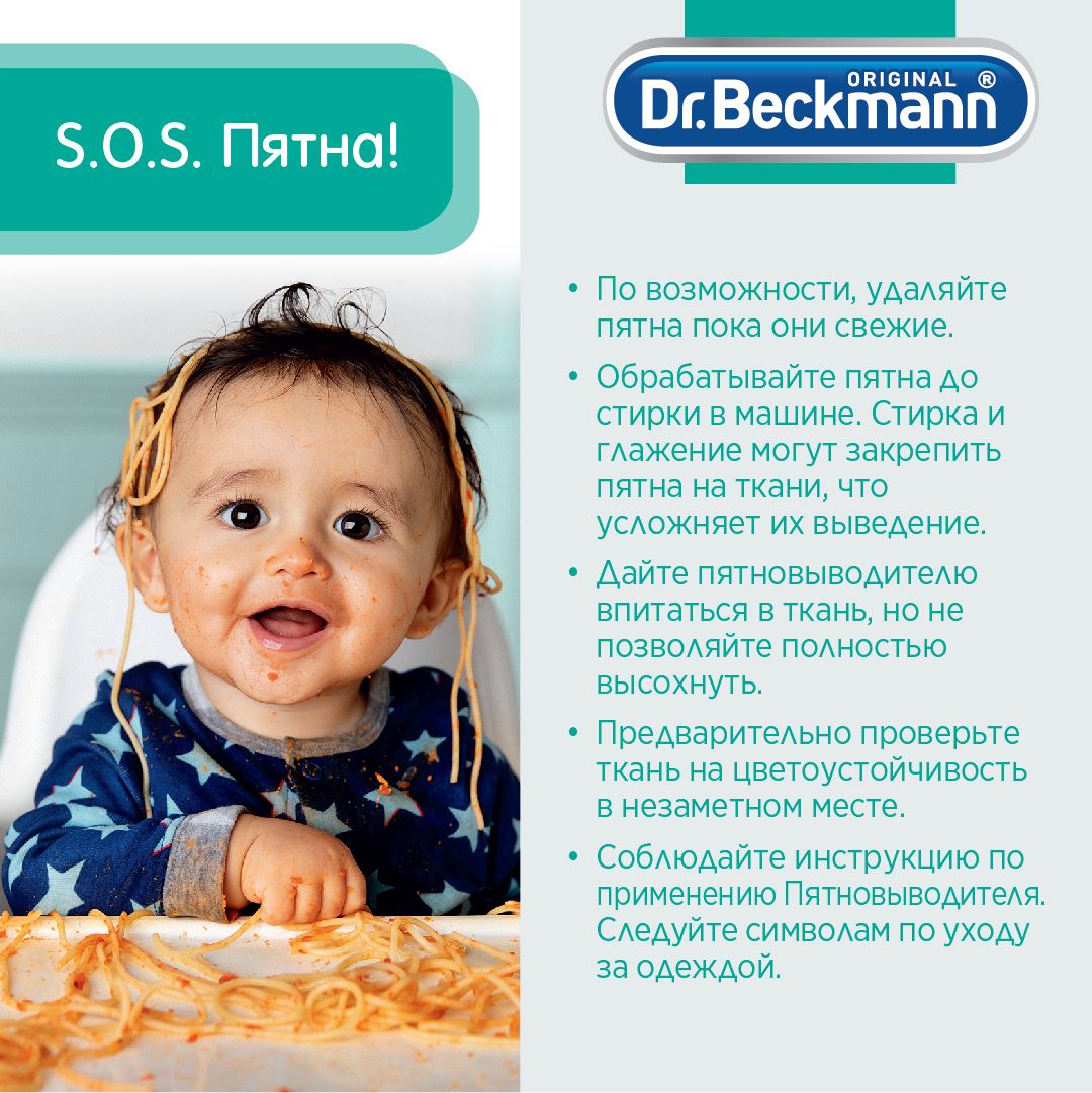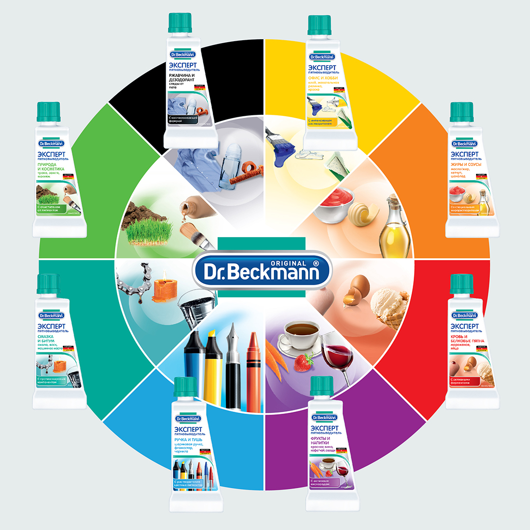 Dr.Beckmann предлагает восемь пятновыводителей на все случаи жизни. Эффективны против более 120 видов пятен. Для каждого пятна свой ЭКСПЕРТ! Будь то красное вино, трава, кофе или шоколад — пятно пятну рознь. В зависимости от состава пятна могут быть весьма специфичными и стойкими. Большинство пятен представляют собой смесь жиров, белков, крахмала или различных красителей, которые, однако, в каждом случае могут быть скомбинированы различным образом. Итак, решающим фактором для успешного выведения пятен является выбор средства, которое подходило бы именно для данного пятна. Чем более специфичным или сложным является пятно, тем более специальным должно быть и средство для его удаления. Поэтому Dr.Beckmann специально разработал восемь различных пятновыводителей, каждый из которых со своей индивидуальной формулой специализируется на выведении пятен определенного типа.