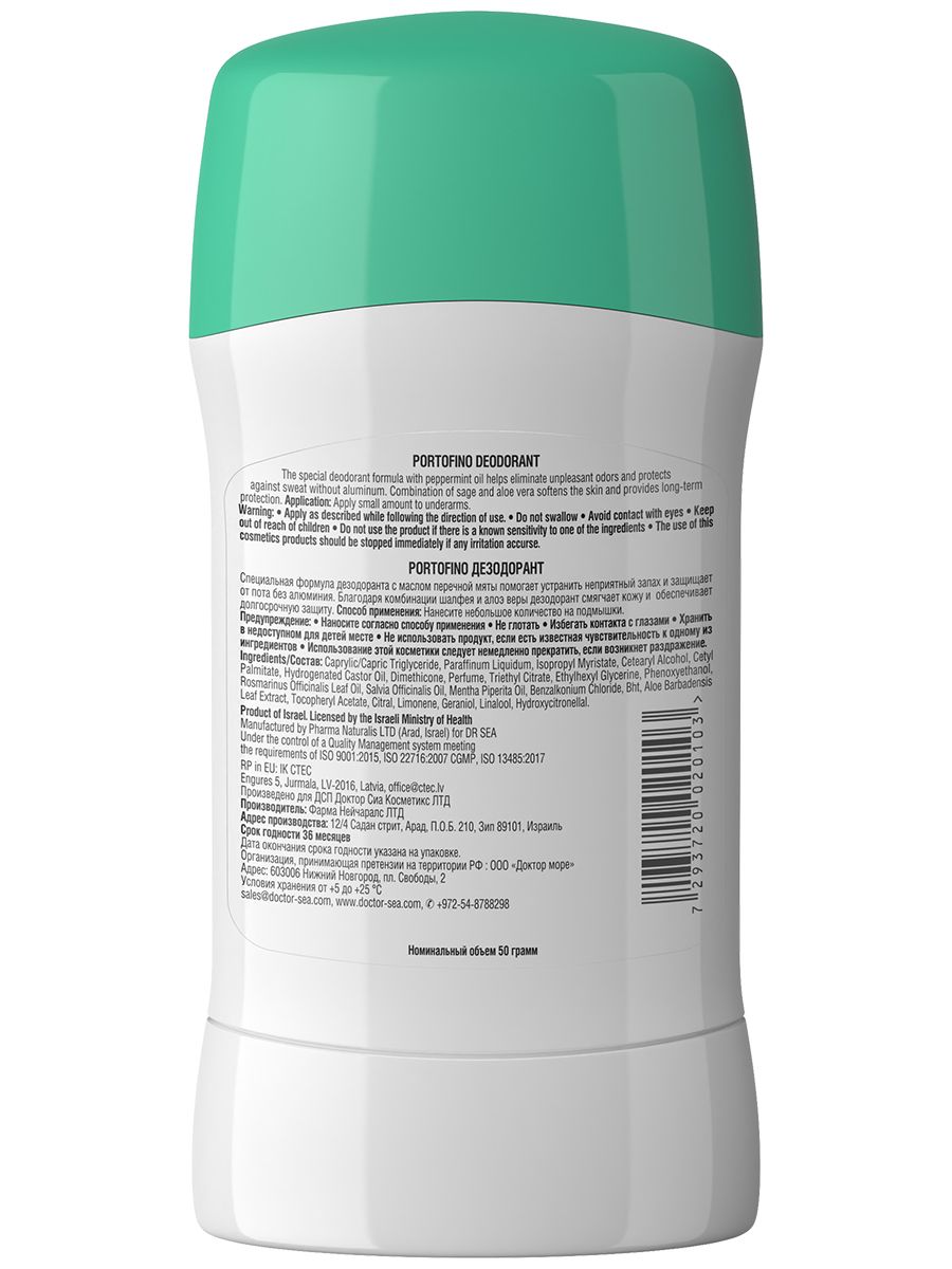 Dr. Sea / Натуральный женский стик дезодорант PORTOFINO, без алюминия с маслом перечной мяты, шалфея и алоэ вера, 50гр.