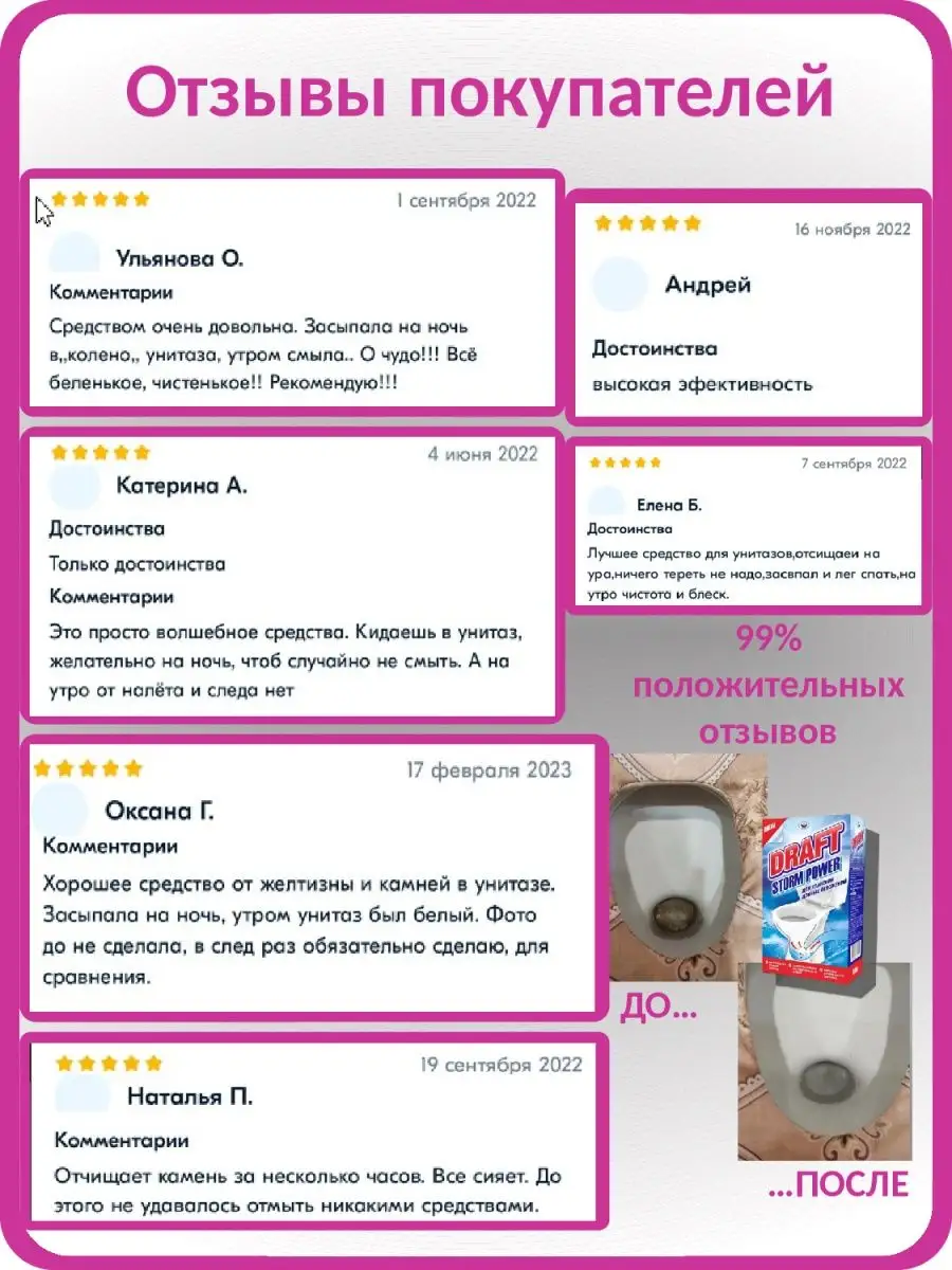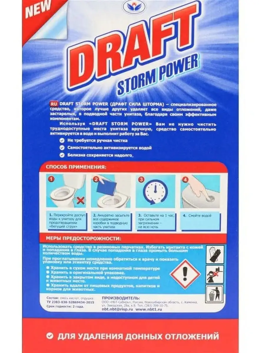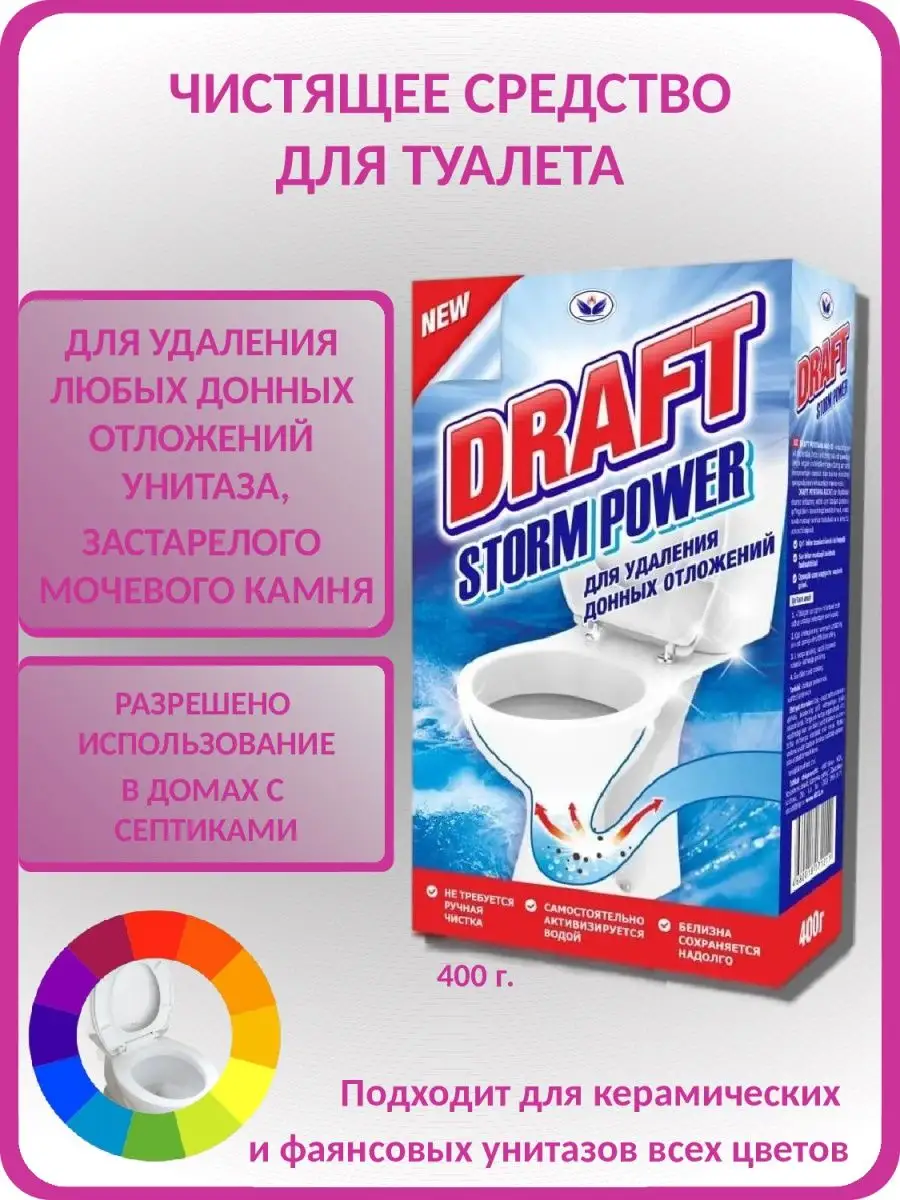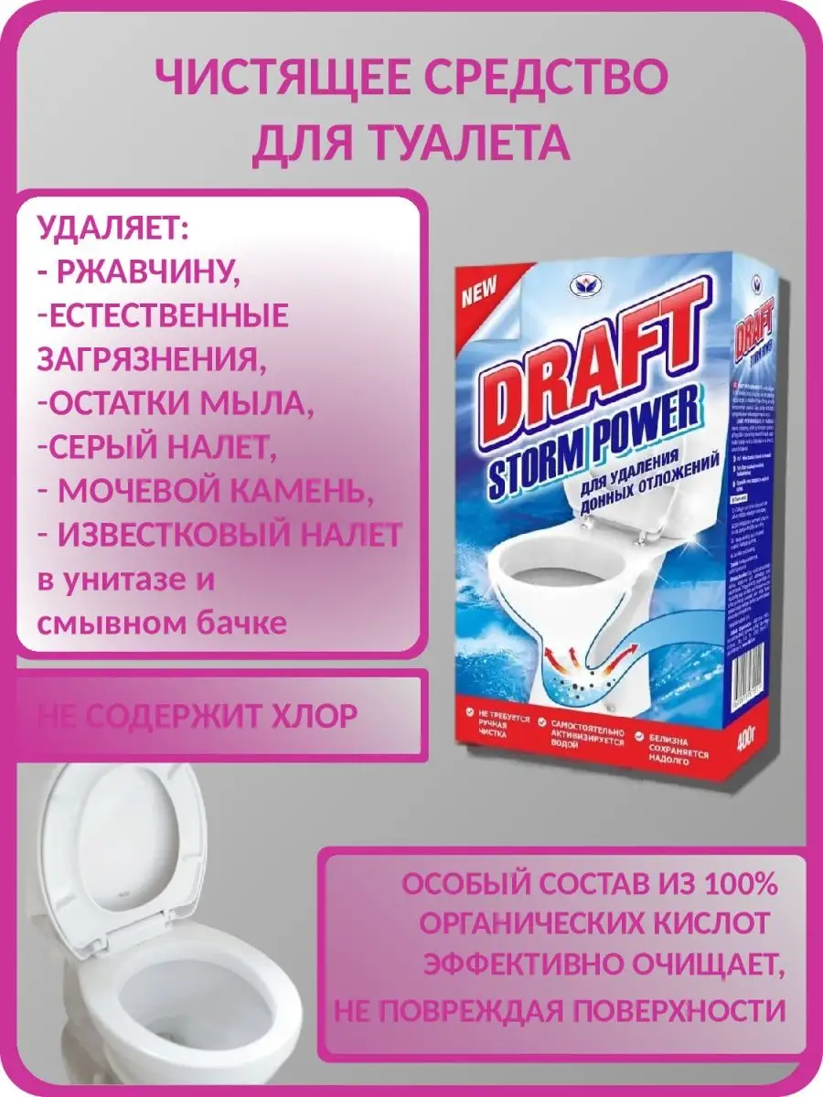 Описание: Draft Storm Power - чистящее средство для унитаза, которое идеально удаляет все виды отложений, даже застарелых, в подводной части унитаза. Чистящее средство для сантехники обладает эффектом "антиналет" и "антиржавчина", помогает избавиться также от известкового налета, грязи, ржавчины, серого налета, запаха. Очиститель унитаза Draft Storm Power - также суперэффективное средство от мочевого камня в унитазе. Вам больше не нужно чистить труднодоступные места вручную: чистящее средство для туалета самостоятельно активизируется в воде и выполнит всю работу по чистке туалета за Вас! Эффективно удаляет ржавый, известковый и органический налет, придает унитазу блеск и белоснежное сияние всего за несколько часов. Draft Storm Power - чистящее средство, которое избавит Вас от необходимости замены старой сантехники, отчистив ее до состяния новой. Средство можно использовать также для удаления известкового налета с поверхности раковин и ванн и для очистки смывного бачка унитаза.