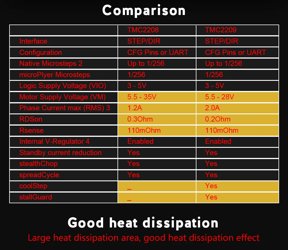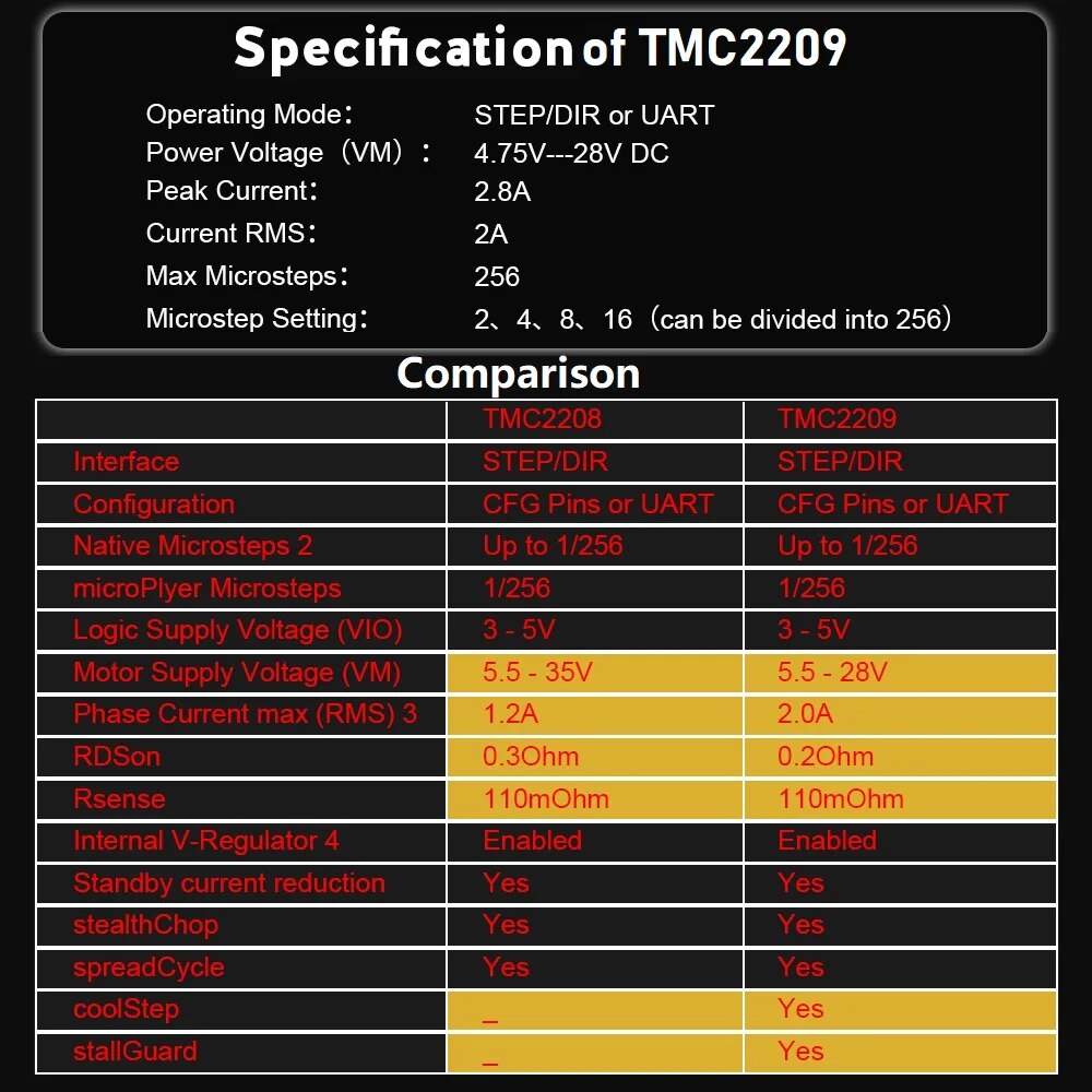 В чем разница между бесшумными шаговыми палочками TMC2208 и TMC2209?