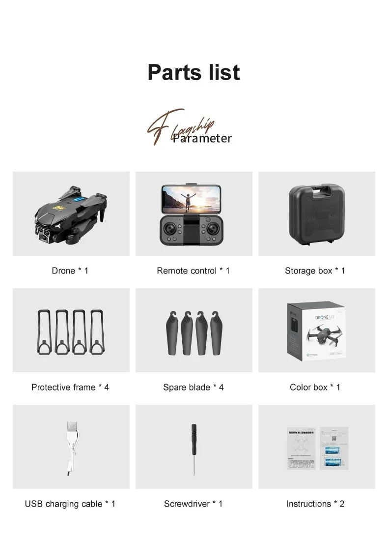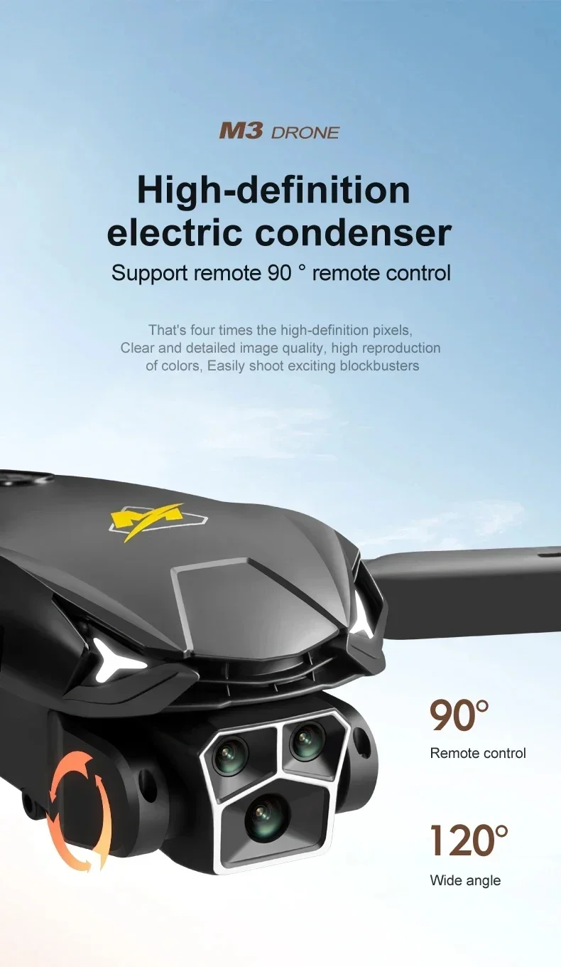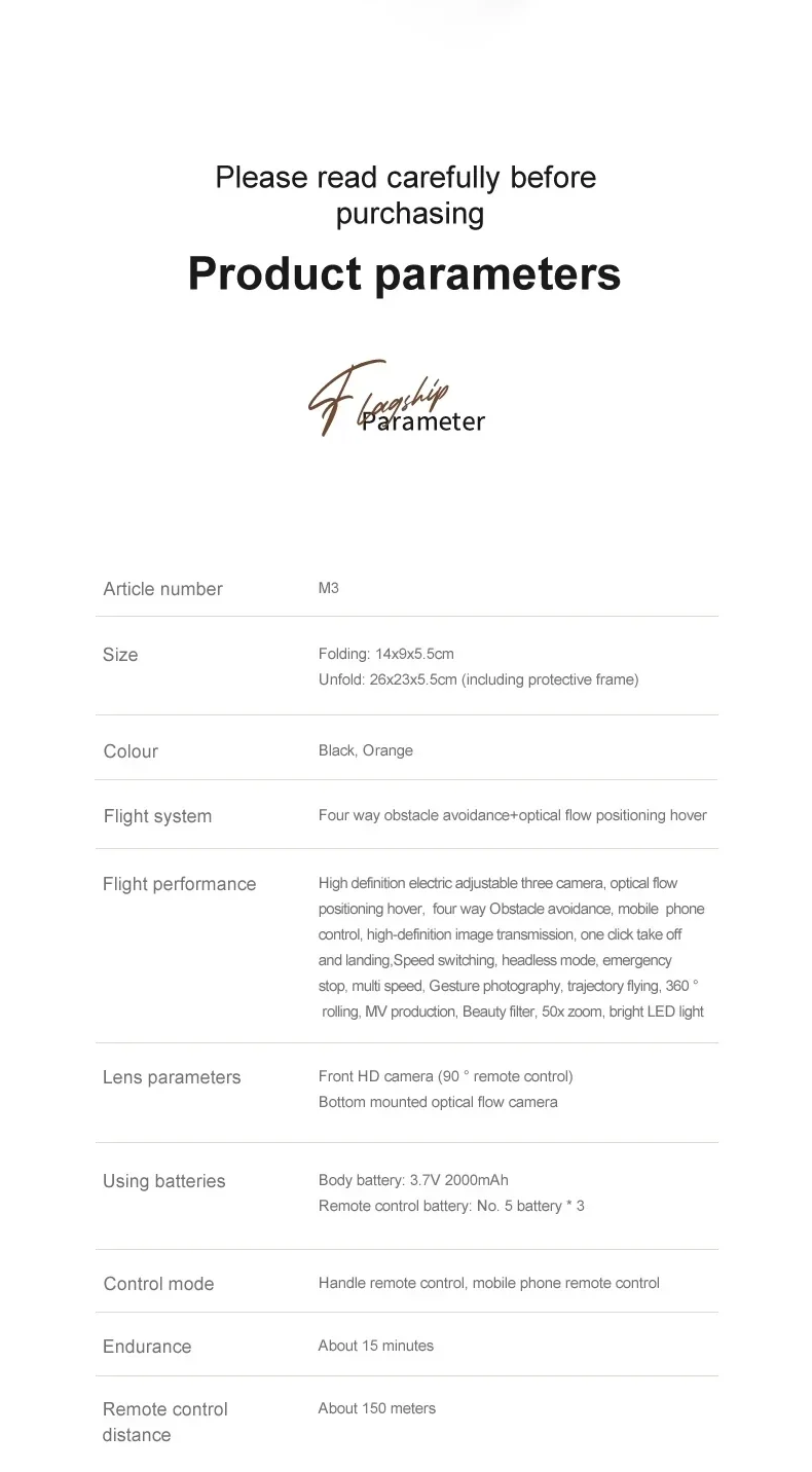 Пункт НЕТ. : М3 Материал: АБС-пластик и электронные компоненты Цвет: черный, оранжевый Гироскоп: 6-осевой Частота: 2,4 г Канал: 4CH Мотор: 716 Матовый двигатель без сердечника Батарея: батарея Lipo 3,7 В 2000 мАч (в комплекте) Питание передатчика: 3 батарейки типа АА (не входят в комплект) Режим передатчика: режим 2 (левый дроссель) Время полета: около 15 минут Низкая скорость полета: 2 м/с Средняя скорость полета: 4 м/с Высокая скорость полета: 7 м/с Время зарядки: 60 минут Расстояние FPV: 15-30 м FPV: Wi-Fi Камера: расположение оптического потока с тремя камерами Разрешение: 4K/6K/8K Размер квадрокоптера: 26*23*5,5 см (в разложенном виде) 14*9*5,5 см (в сложенном виде) Особенности: -Складная рука, удобная для переноски. -Три камеры со свободным переключением, альбомная/вертикальная/верхняя съемка. -Интеллектуальное избегание препятствий спереди, сзади, слева и справа. Когда функция предотвращения препятствий включена, она автоматически избегает препятствий. -Он имеет функцию позиционирования оптического потока, режима поддержания высоты и стабильного полета. -В безголовом режиме нет необходимости регулировать положение самолета перед полетом. -Взлет/посадка в одно касание. -Через функцию Wi-Fi он может подключаться к приложению и системе APK и снимать фотографии, видео и передачу в реальном времени через изображение с мобильной камеры. -Нарисуйте на экране траекторию полета, и БПЛА будет летать автономно по заданной траектории. -Опыт VR 3D. Через мобильное приложение с очками VR вы можете почувствовать пустоту с точки зрения. -Производство МВ и музыкальное дополнение. -Модульная батарея 3,7 В 2000 мАч, проста в установке и переноске, срок службы батареи до 15 минут. -Технология защиты от помех 2,4 ГГц. -Четыре канала используются для подъема, убывания, продвижения, отступления, полета влево и вправо. -Шестиосевой гироскоп, более стабильный полет и более удобное управление. -Светодиодные фонари делают полет более зрелищным, особенно в темноте. Функции:   Вверх/вниз, спереди/сзади, поворот влево/вправо, боковая муха, светодиодные фонари, режим без головы, режим удержания высоты с помощью оптического потока, три камеры, четырехстороннее Предотвращение препятствий, электрически регулируемая камера, WiFi FPV Включенный пакет: 1 х M3 Дрон 1 х пульт дистанционного управления 1 х 3,7 В 2000 мАч аккумулятор 1 х USB-кабель для зарядки 4 х Запасное лезвие 4 х защитный чехол 1 х держатель для телефона 1 х Отвертка 1 х Руководство 1 х ящик для хранения 1 х Цветная коробка