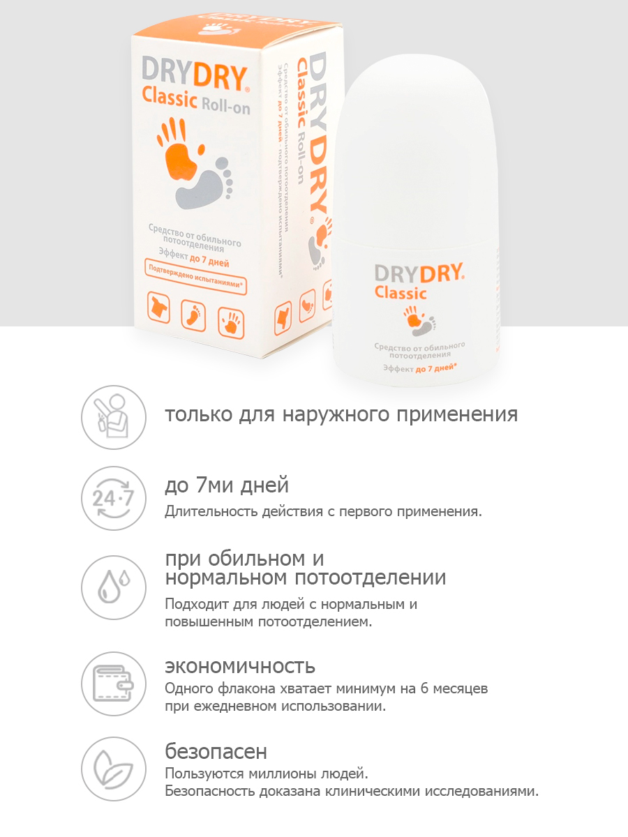 Шариковый антиперспирант ДРАЙ ДРАЙ Классик – действенное средство от гипергидроза для мужчин и женщин. Использовать его можно для обработки подмышек, ладоней рук и стоп ног. Миллионы покупателей уже оценили его эффективность в борьбе с повышенным потоотделением и признали лучшим в этой области.