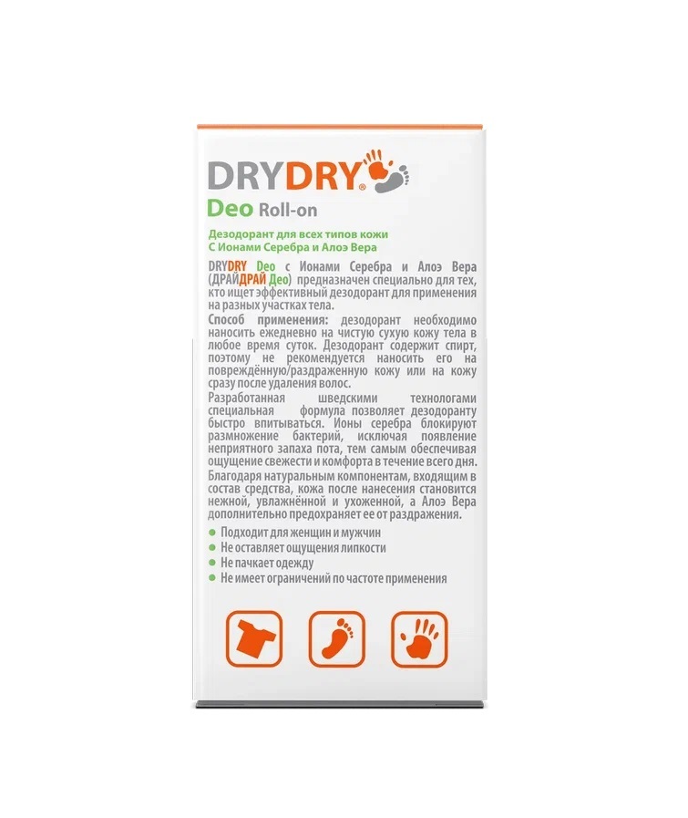 Описание: Средство от повышенного потоотделения Dry Dry Deo Roll-on / Драй Драй Део с Ионами Серебра и Алоэ Вера предназначен специально для тех, кто ищет эффективный дезодорант для тела.