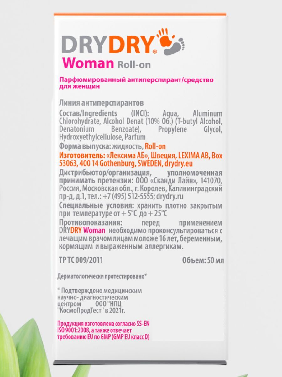 Описание: DRYDRY Woman Roll-on - Парфюмерно-косметический антиперспирант/средство, рекомендованное к использованию при нормальном и обильном потоотделении. Разработано шведскими технологами специально для женщин.