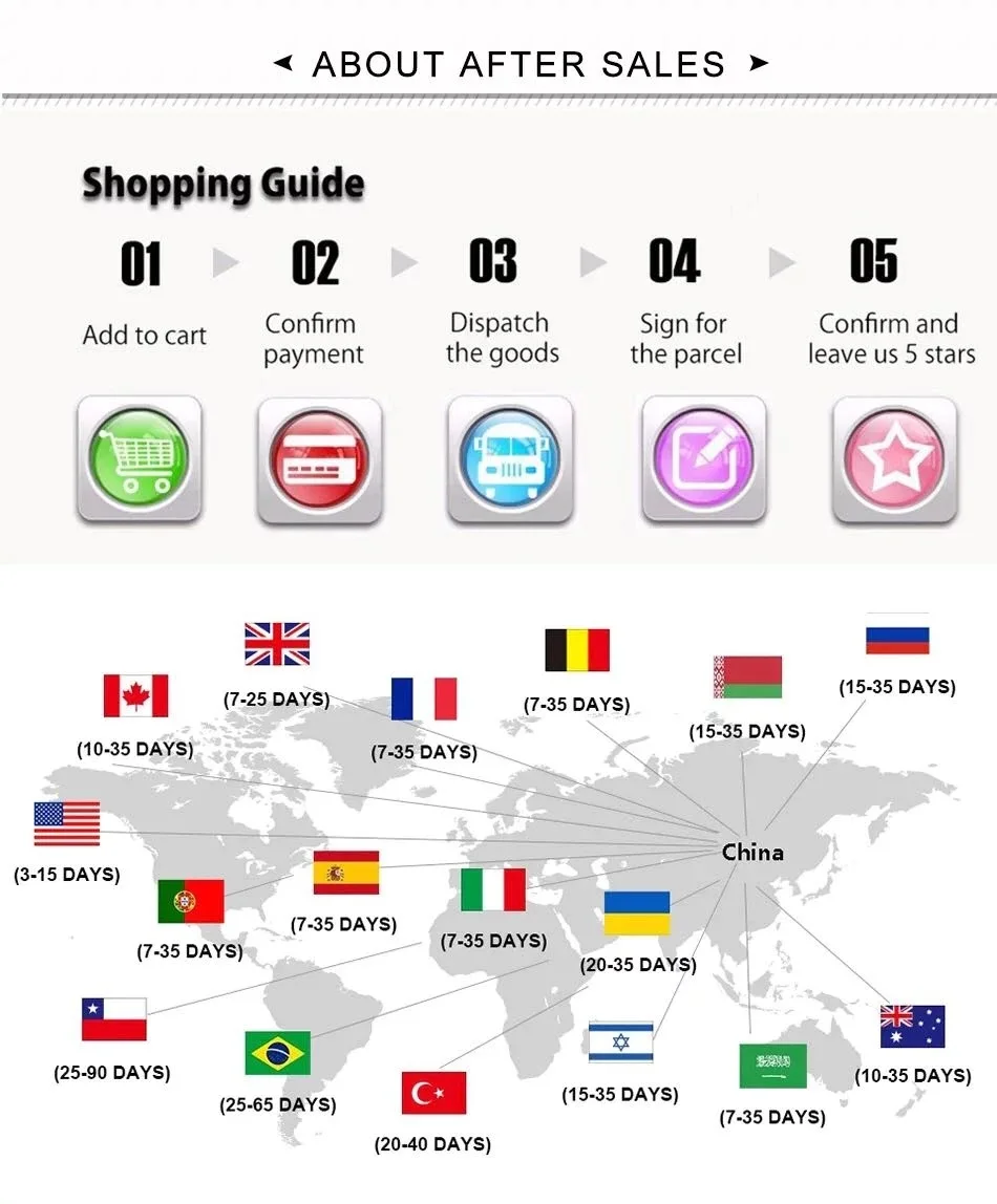 2. Доставка в вашу страну займет 10-45 дней. Иногда это займет больше времени из-за различных факторов.