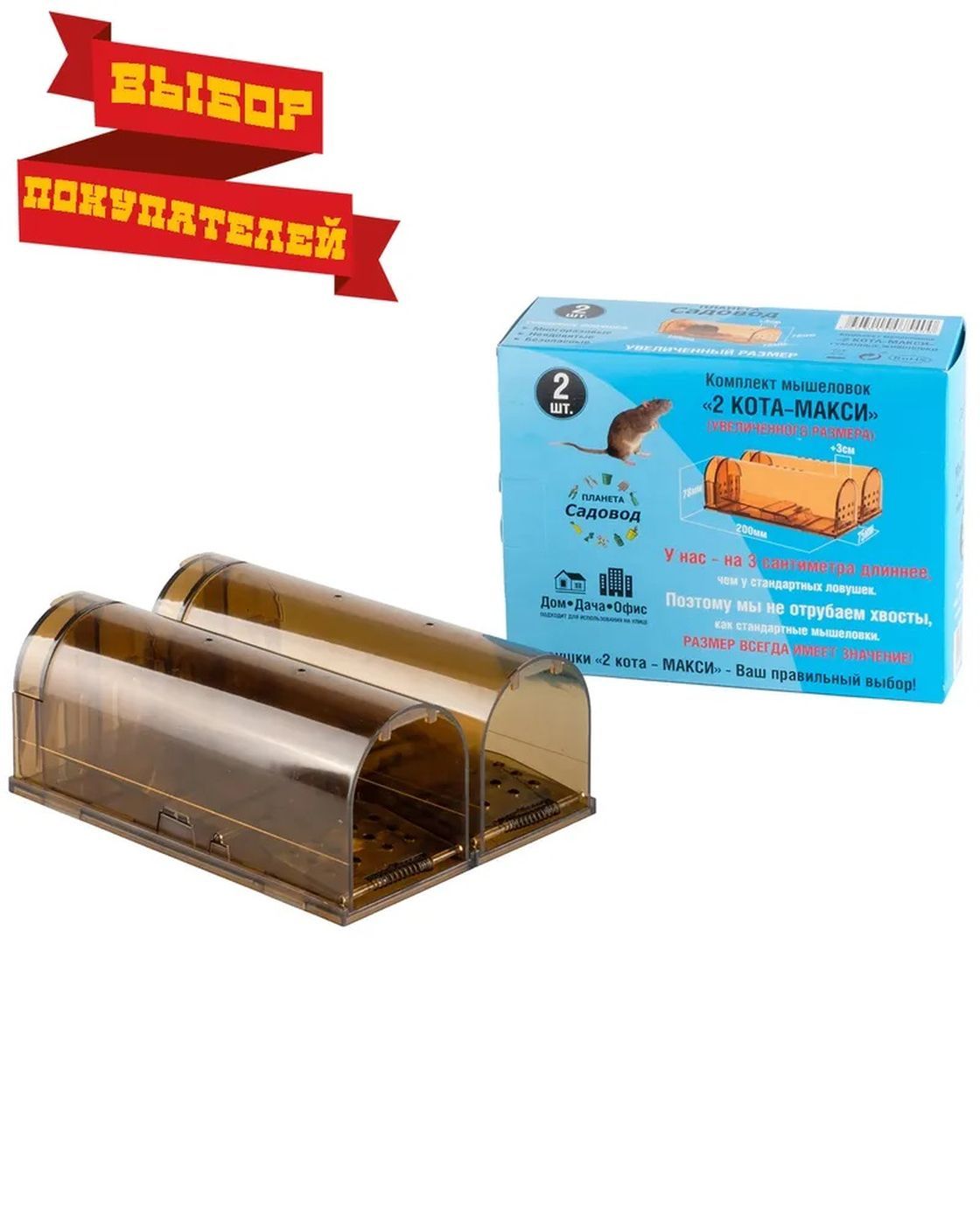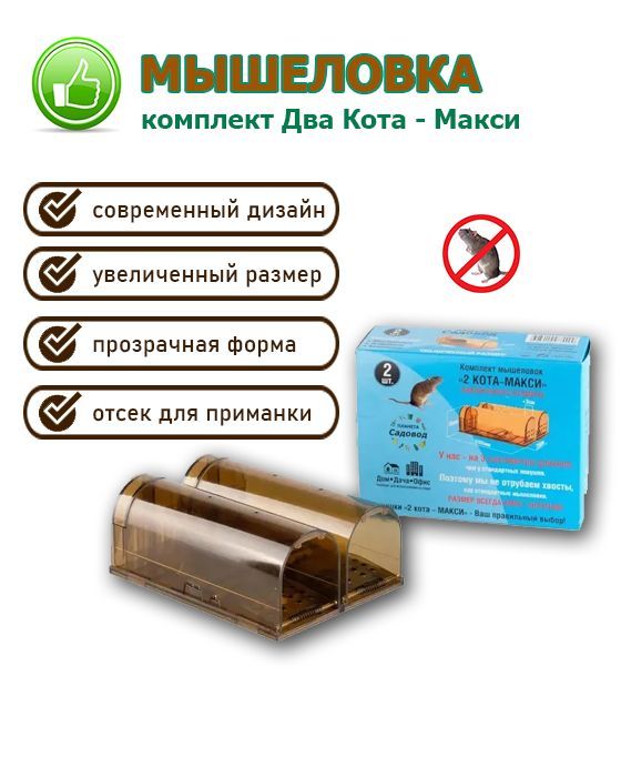 Описание: мышеловка два кота максиКомплект Два Кота Макси ШоколадДве упакованные в коробку мышеловки увеличенного размераОсобенности1. Подходят для отлова мышей и небольших крысят.