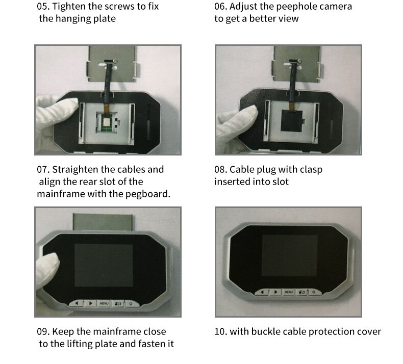 • Визуальный дверной звонок HD:Наслаждайтесь кристально чистыми видеоматериалами вашего порога с 2,4-дюймовым глазком с полем обзора 120 градусов и разрешением 240x320 HD.