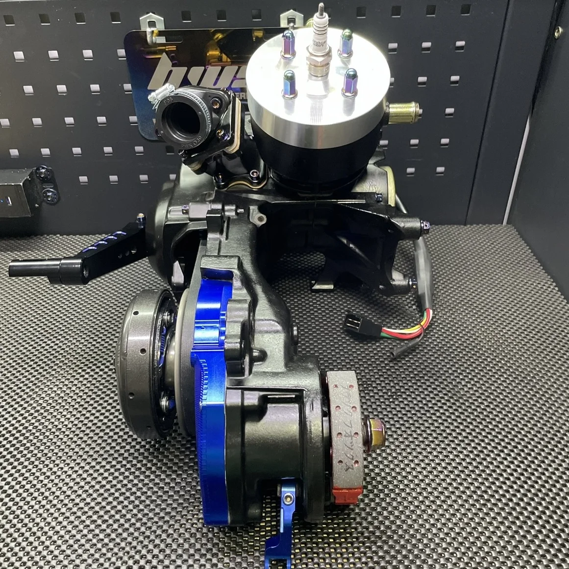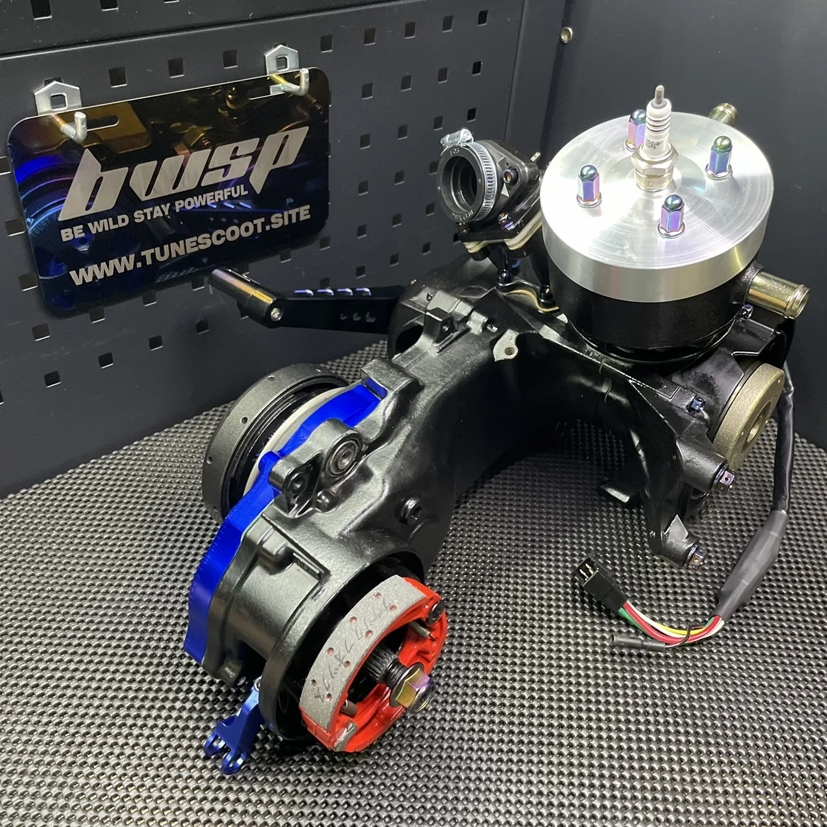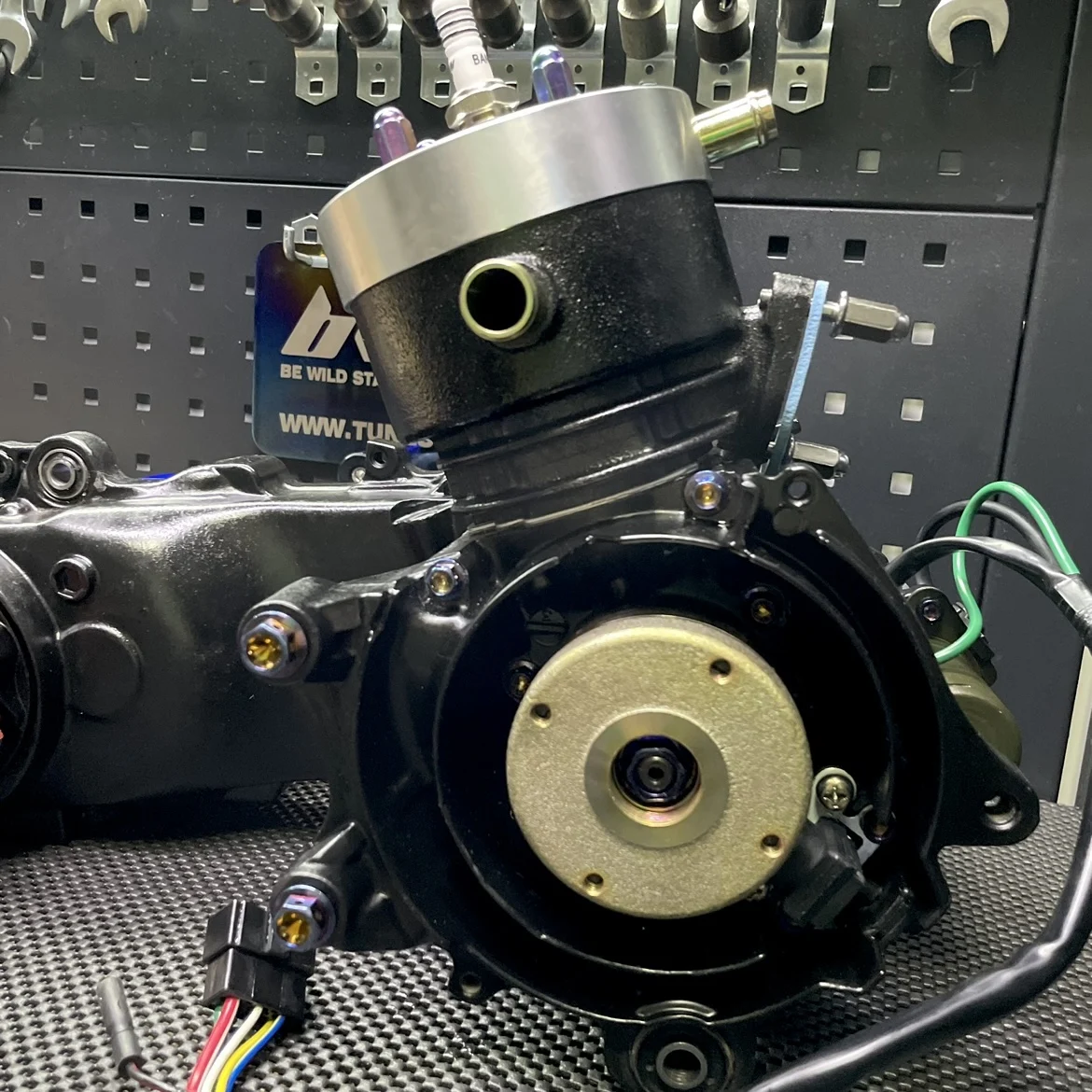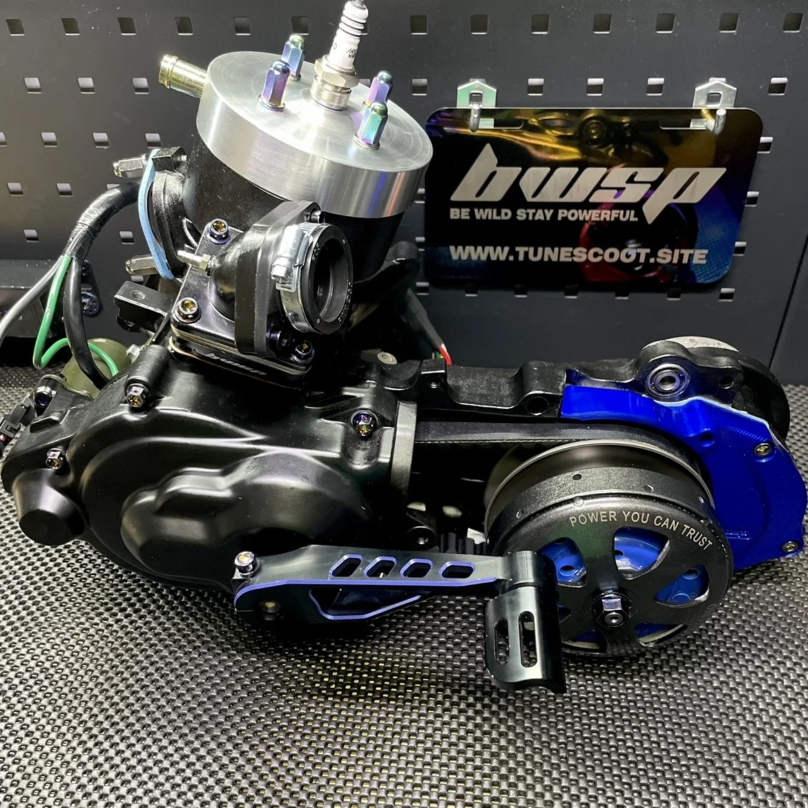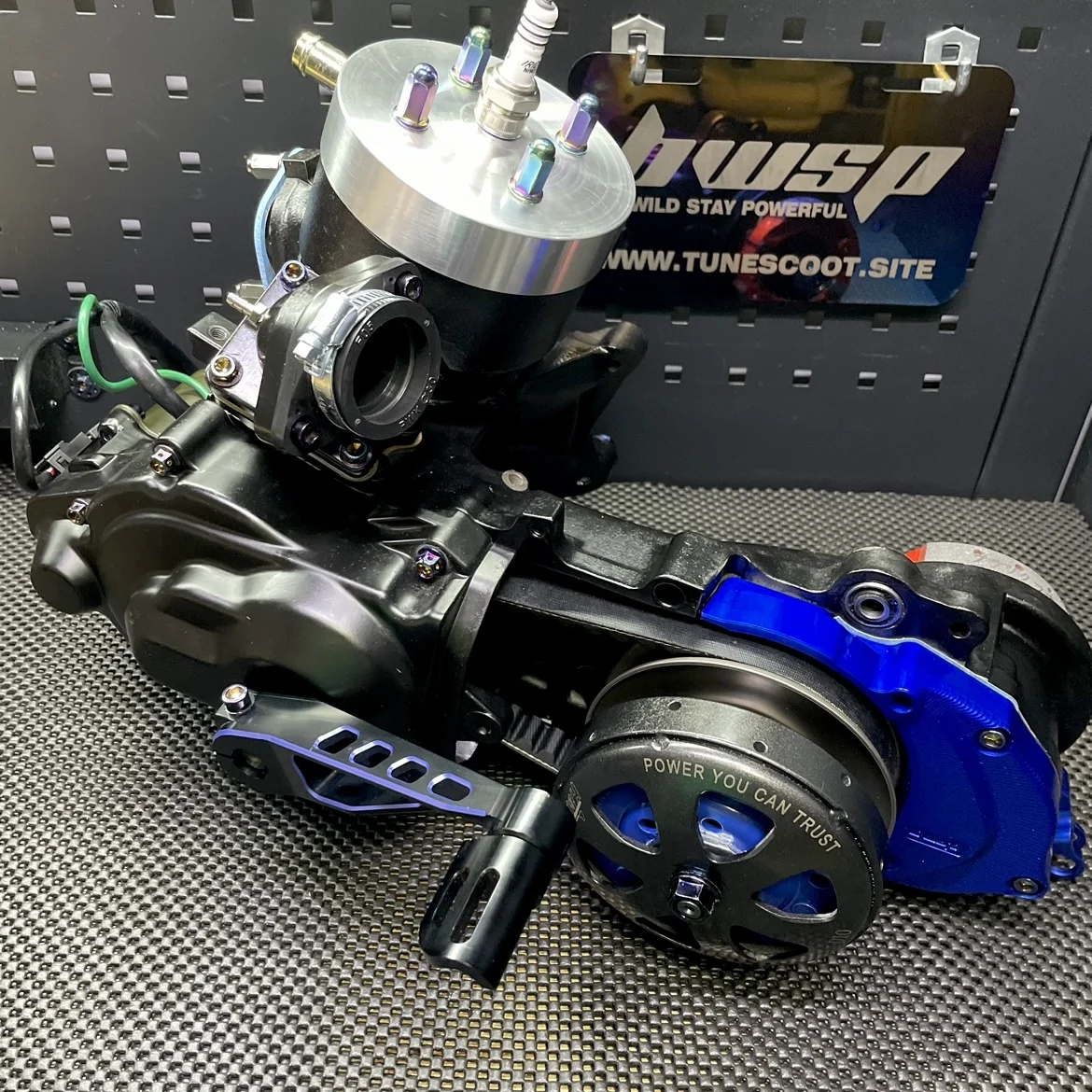 Установленные Детали: круглый цилиндр 54 мм с головкой блока цилиндров заготовки, кованый коленчатый вал 53 мм с длинным ходом + 4, крутящий момент с шестью высокоугловыми канавками, легкая муфта 107 мм, вариатор 92 мм, кованая приводная поверхность, приводной ремень 654 мм, пружина 1500 об/мин, ролики 8g, мощный стартер, модифицированные вторичные и первичные шестерни (15/38 зуб.), Крышка коробки передач заготовки, коллектор большего размера 28 мм, зажигание ротора с генератором на 8 катушек, тормозные колодки, Свеча зажигания, Прокладка выхлопной трубы, коромысло заднего тормозного рычага, крышка cvt и ножка кик-стартера.