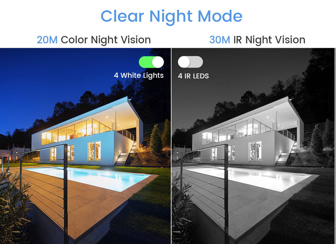 Эта камера видеонаблюдения с разрешением 2K и разрешением Full HD оснащена 4 ИК-светодиодами и 4 белыми источниками света, которые обеспечивают четкое ночное видение на открытом воздухе — до 20 м в цвете и 30 м в черно-белом режиме, с тремя режимами ночного видения на выбор.