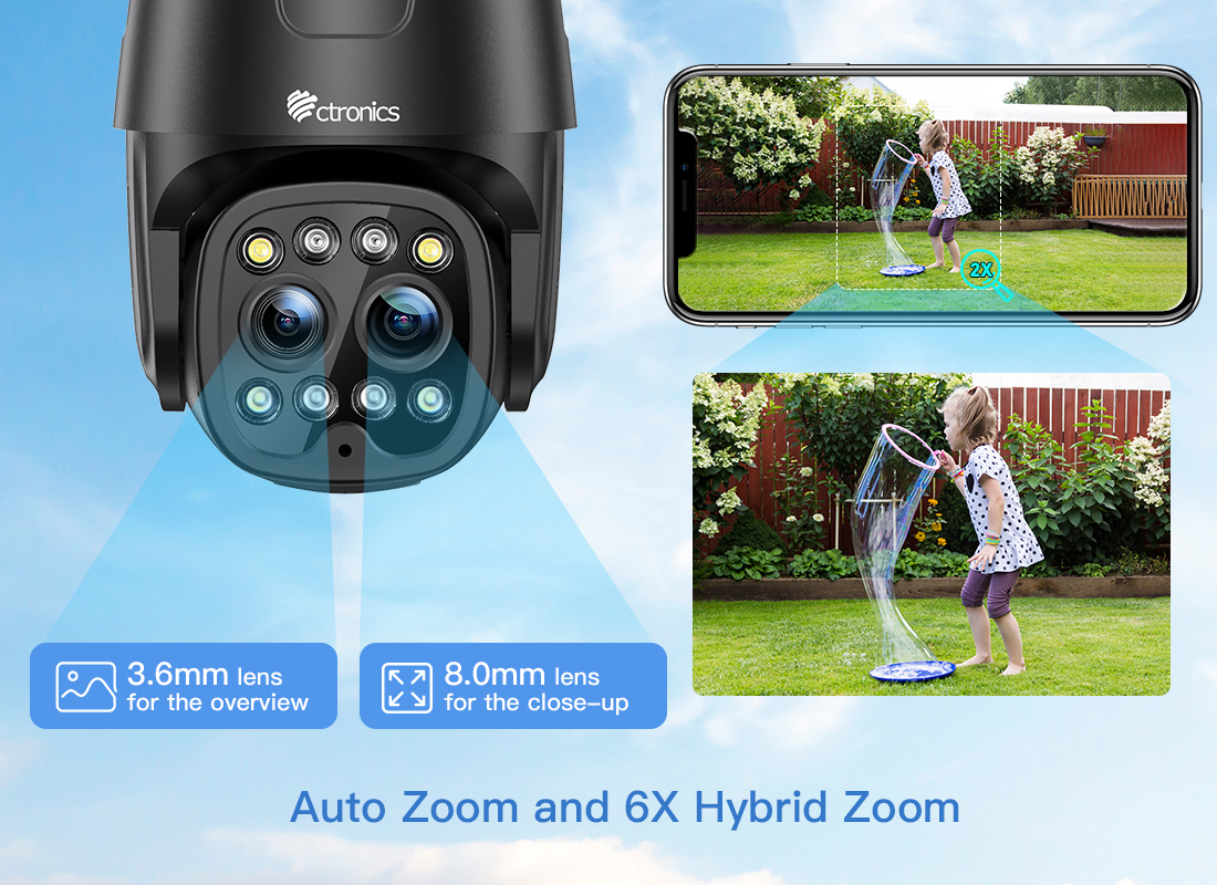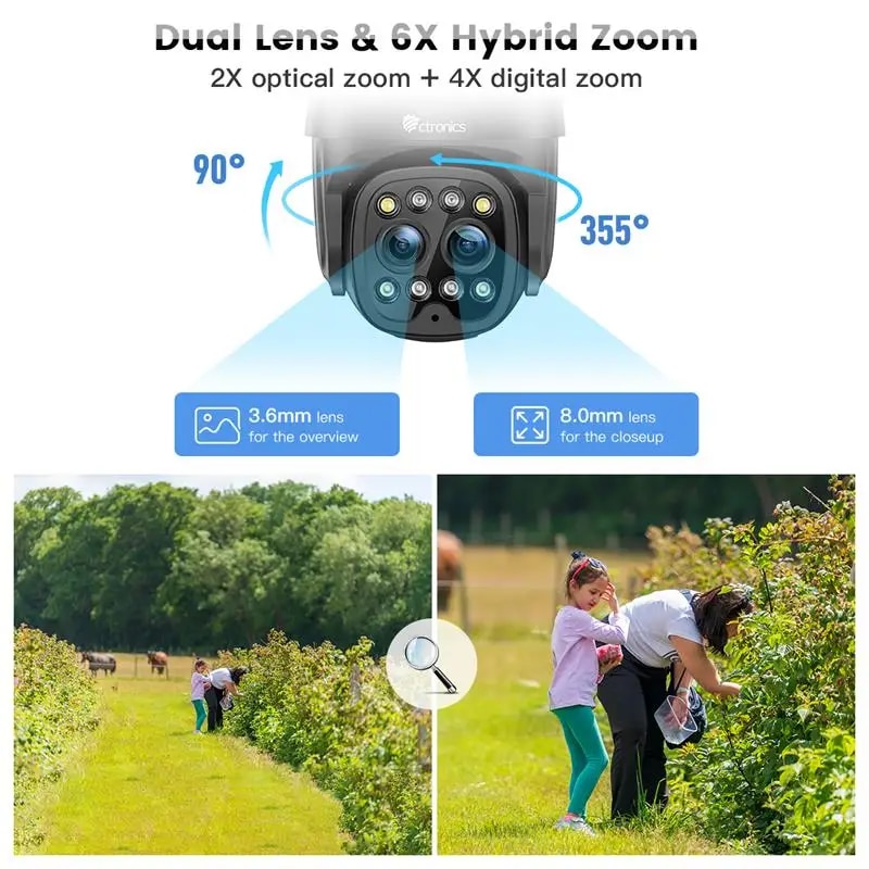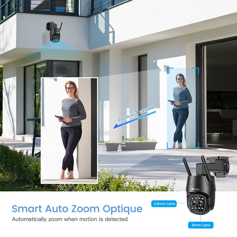 Эта водонепроницаемая наружная WiFi-камера наблюдения оснащена двумя объективами: датчик A использует телеобъектив 8 мм для захвата деталей даже с близкого расстояния, а датчик B использует широкоугольный объектив 3,6 мм для панорамных изображений.
