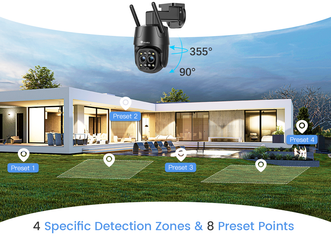 Когда эта купольная камера PTZ 360° обнаруживает движение человека, она автоматически начинает отслеживать, когда активируется функция автоматического увеличения, камера автоматически меняет объектив и увеличивает масштаб (2-кратное оптическое увеличение), а когда цель исчезает на 60 секунд камера автоматически возвращается к исходному экрану наблюдения.