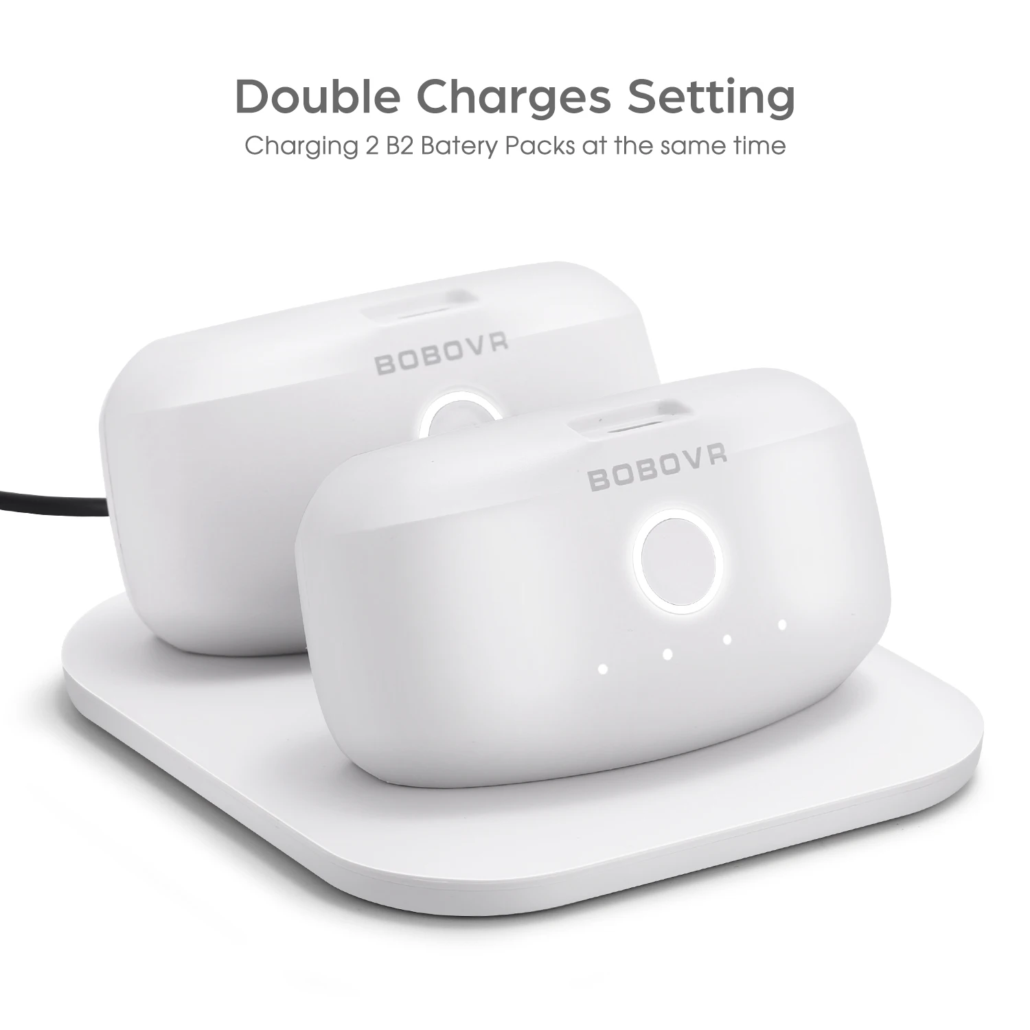 • Зарядная станция имеет очень тонкий и простой языковой дизайн, который экономит место на рабочем столе и имеет 2 положения зарядки, которые могут заряжать 2 аккумуляторных блока BOBOVR B2 одновременно.