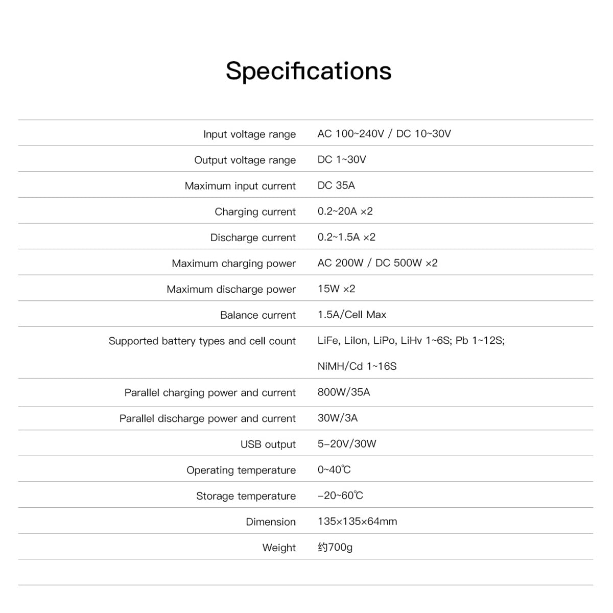 Двухканальное зарядное устройство для литий-полимерных аккумуляторов AC 200 Вт DC 500Wx2 20A