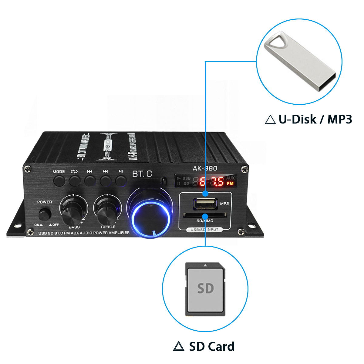 -Для SD-карты, U-диска, входа AUX, воспроизведения в формате MP3, поддержки беспроводного подключения bluetooth.