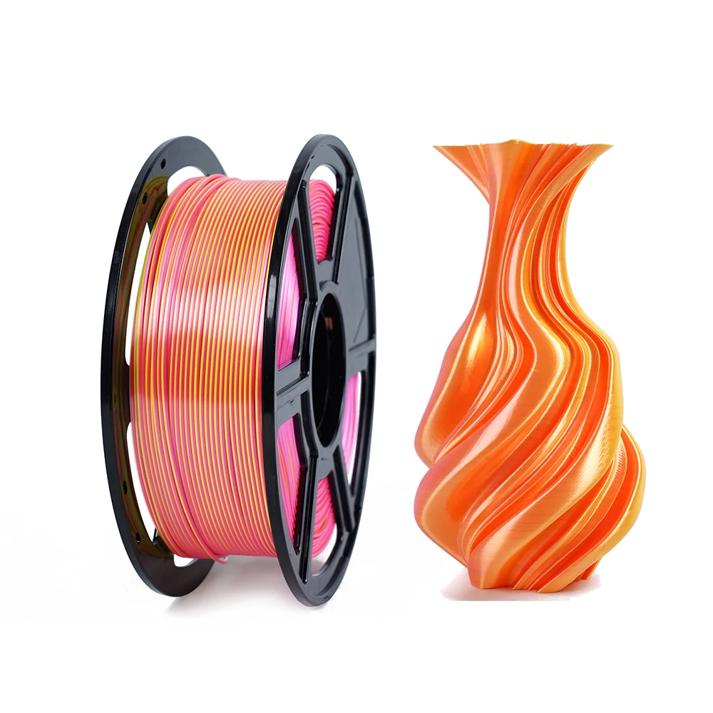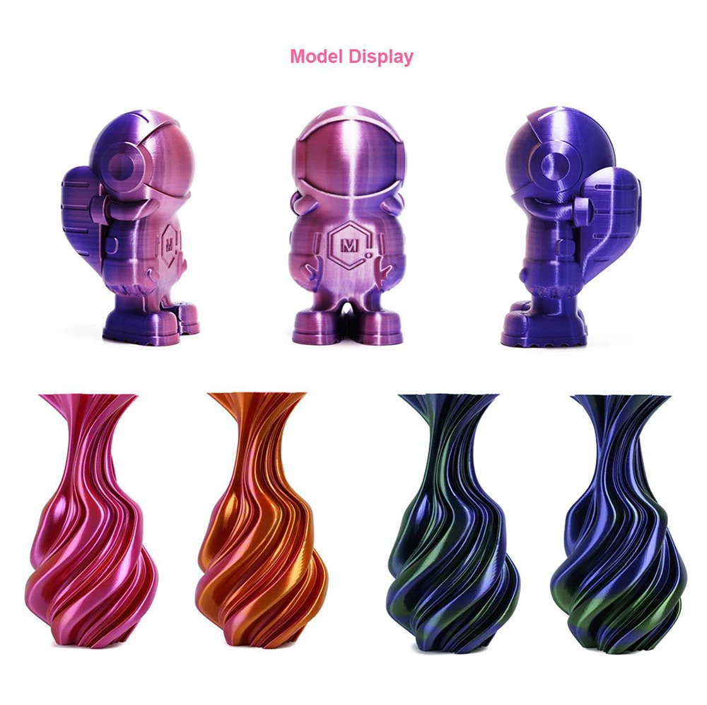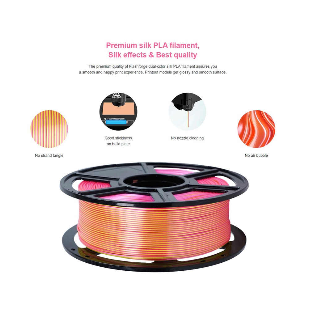 Двухцветный ПЛА-шелк премиум-класса гарантирует отсутствие проблем с запутыванием нитей, отсутствие блокировки сопел принтера, отсутствие пузырьков воздуха при печати, прочную адгезию слоя и глянцевую поверхность на печатных моделях. Лучший опыт использования.