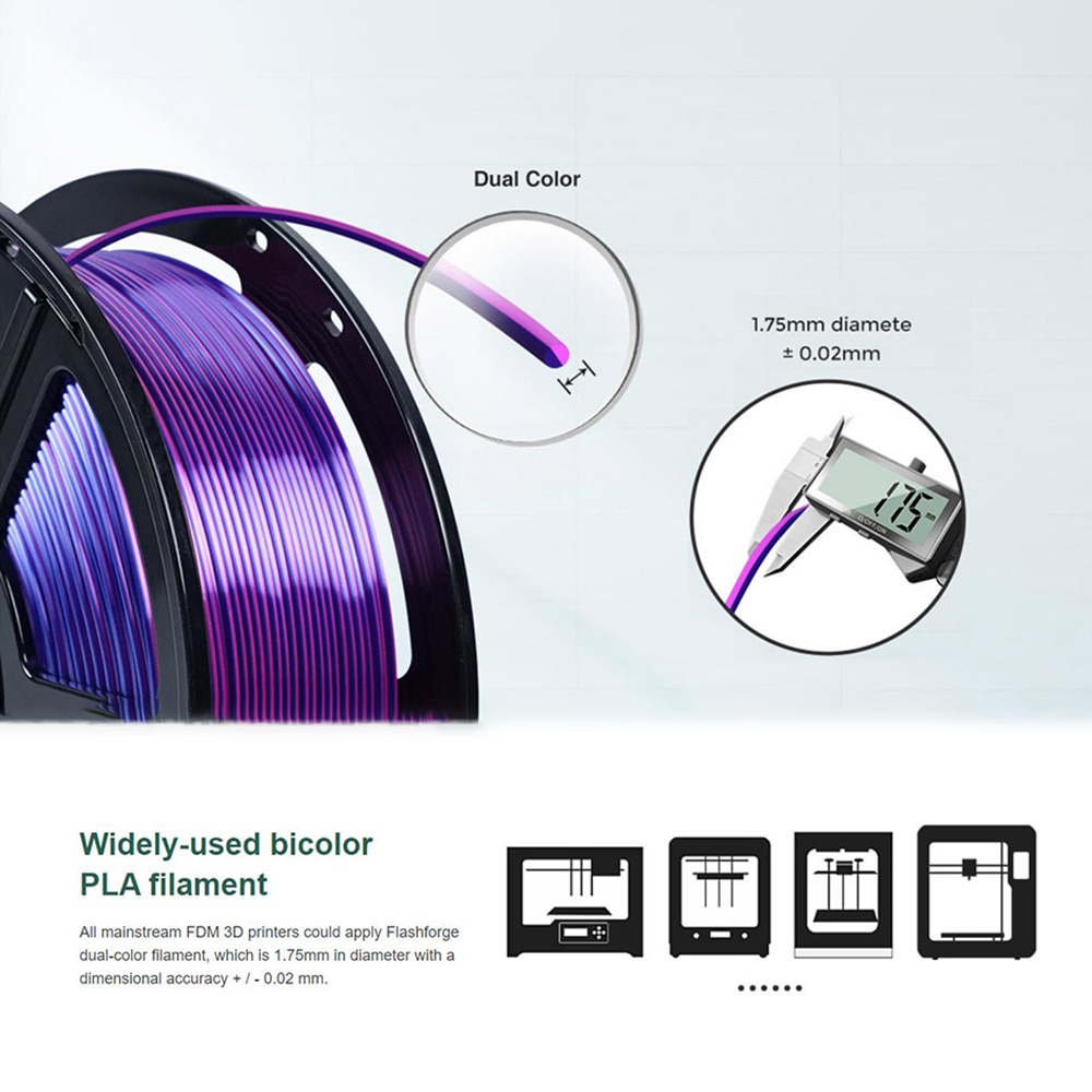 Все основные 3D-принтеры FDM могут использовать двухцветную нить Flashforge диаметром 1,75 мм с точностью размеров + / -0,03 мм.