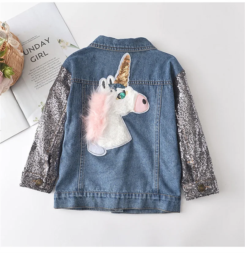 Джинсовые куртки с единорогом для девочек, модные детские блестящие пальто, новинка на весну и осень, Джинсовая Верхняя одежда с блестками, одежда для девочек