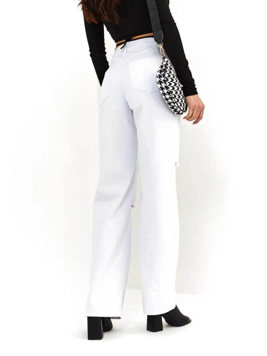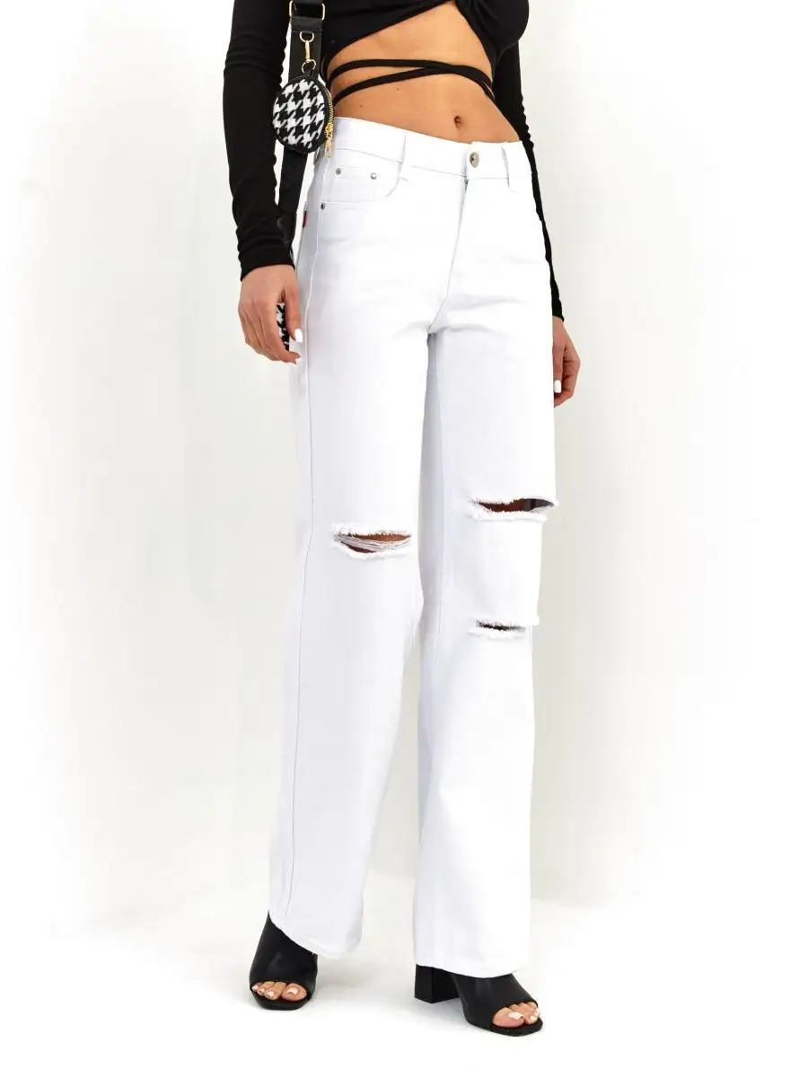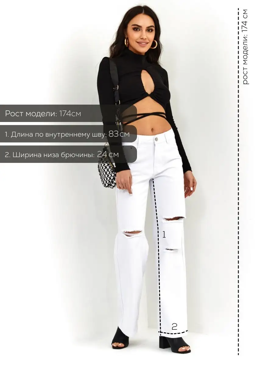 Описание: Джинсы рванные - модель с высокой посадкой, декорированная дырками, потертостями. Прямые, широкие от бедра джинсы с разрезами- актуальный тренд 2023 года. Однотонные демисезонные стильные джинсы женские универсальный предмет гардероба, подходящий для лета, весны. Возможность комбинировать различные стили как классические, так и офисные, поможет создать множество образов. Молодежные брюки с карманами по бокам будут органично сочетаться с лонгсливами, свитерами, толстовками, худи, блузами и футболками. Дополнить весенний лук помогут стильные аксессуары и обувь - кеды, ботинки на плоской подошве или каблуке, кроссовки, туфли. Завышенная талия и комфортная посадка акцентирует внимание на женственных очертаниях фигуры, корректируя визуально несовершенства. Двойная застежка в виде молнии и пуговицы позволяет модели плотно прилегать по бедрам. Универсальный крой с вырезами рассчитан на различные возрастные категории. Палаццо могут надеть подростки, молодые девушки, беременные женщины. Различные модели рассчитаны на худых и полных девушек. Джинсы трубы уникальны своим кроем, подходят для высоких и невысоких. Брюки клеш типа oversize - стильное решение для различных сфер жизни - в школу, для прогулки, романтического свидания, в офис, в дорогу. Свободные джеггинсы - практичный подарок для прекрасного пола на любые праздники. Их можно преподнести маме на день матери, дочери - на день рождения, бабушке - на Рождество, подруге, сестре - на Международный женский день. Скидки и распродажи позволят купить у нас красивые джинсы по выгодным ценам.