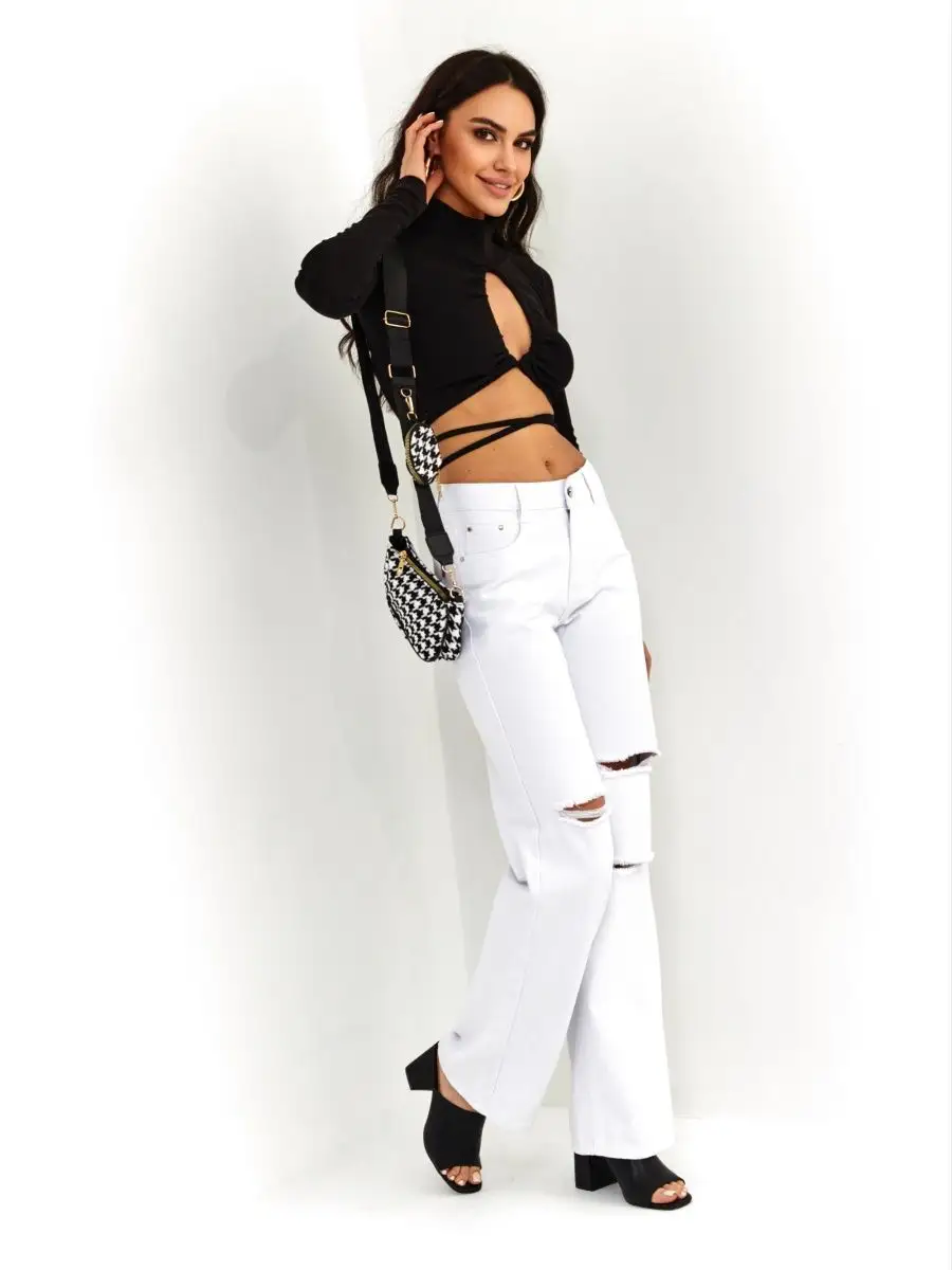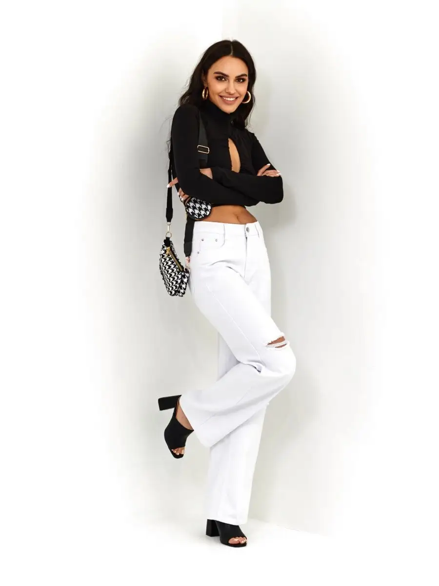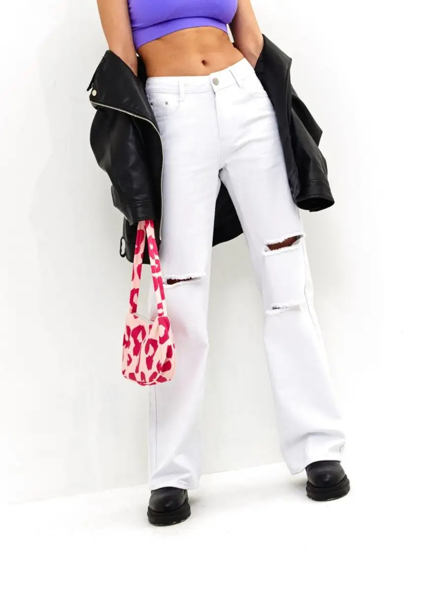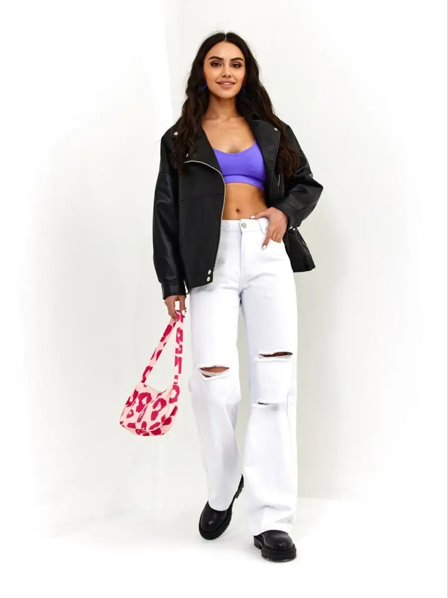 Описание: Джинсы рванные - модель с высокой посадкой, декорированная дырками, потертостями. Прямые, широкие от бедра джинсы с разрезами- актуальный тренд 2023 года. Однотонные демисезонные стильные джинсы женские универсальный предмет гардероба, подходящий для лета, весны. Возможность комбинировать различные стили как классические, так и офисные, поможет создать множество образов. Молодежные брюки с карманами по бокам будут органично сочетаться с лонгсливами, свитерами, толстовками, худи, блузами и футболками. Дополнить весенний лук помогут стильные аксессуары и обувь - кеды, ботинки на плоской подошве или каблуке, кроссовки, туфли. Завышенная талия и комфортная посадка акцентирует внимание на женственных очертаниях фигуры, корректируя визуально несовершенства. Двойная застежка в виде молнии и пуговицы позволяет модели плотно прилегать по бедрам. Универсальный крой с вырезами рассчитан на различные возрастные категории. Палаццо могут надеть подростки, молодые девушки, беременные женщины. Различные модели рассчитаны на худых и полных девушек. Джинсы трубы уникальны своим кроем, подходят для высоких и невысоких. Брюки клеш типа oversize - стильное решение для различных сфер жизни - в школу, для прогулки, романтического свидания, в офис, в дорогу. Свободные джеггинсы - практичный подарок для прекрасного пола на любые праздники. Их можно преподнести маме на день матери, дочери - на день рождения, бабушке - на Рождество, подруге, сестре - на Международный женский день. Скидки и распродажи позволят купить у нас красивые джинсы по выгодным ценам.