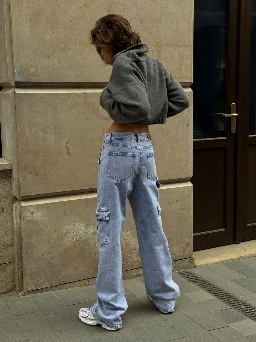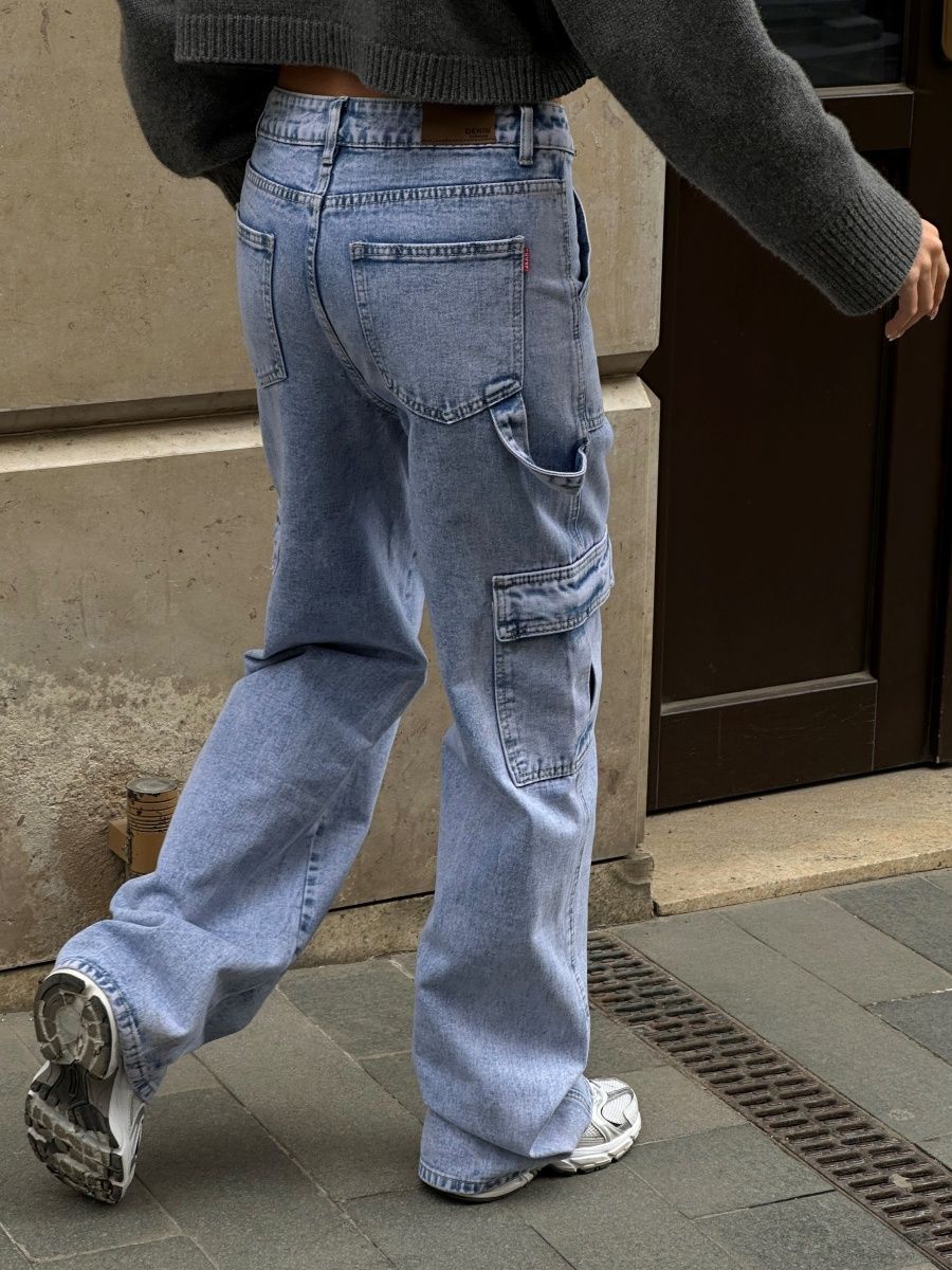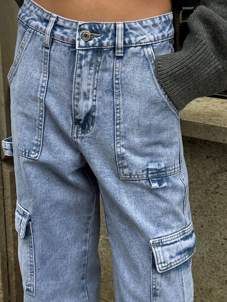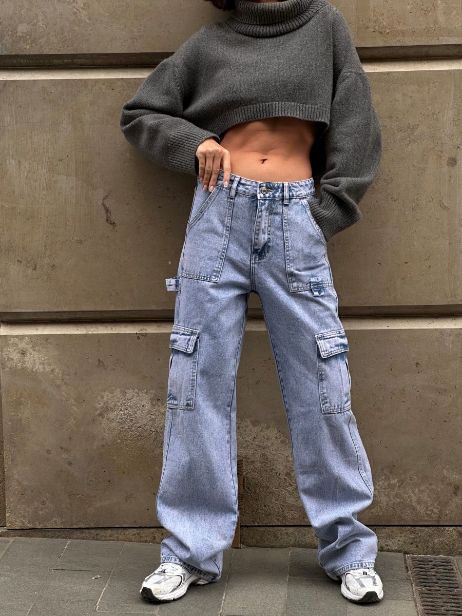 Джинсы женские с высокой посадкой широкие трубы карго