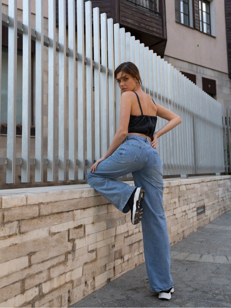 Джинсы женские с высокой посадкой широкие трубы карго