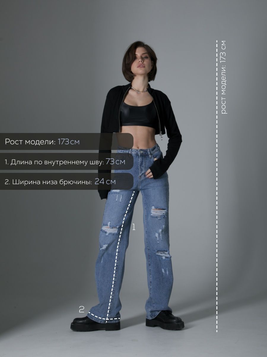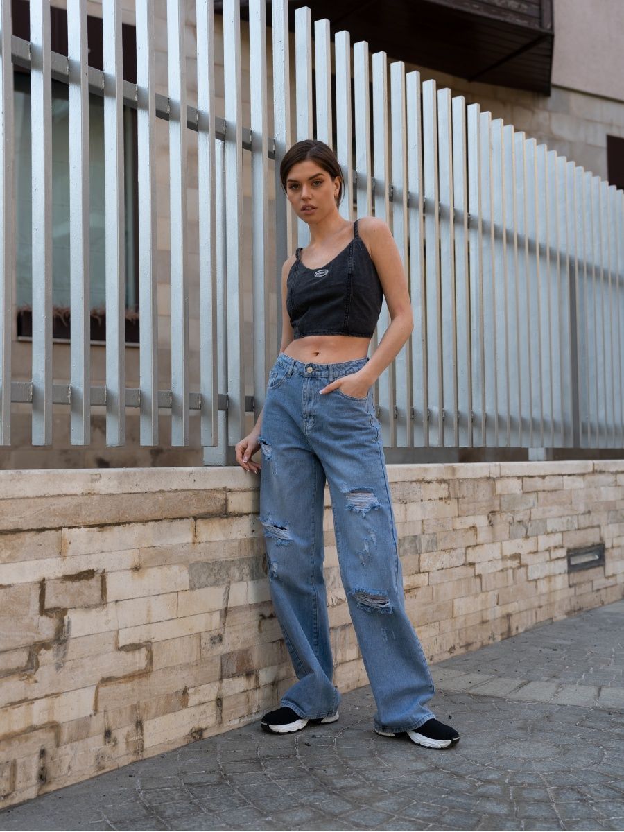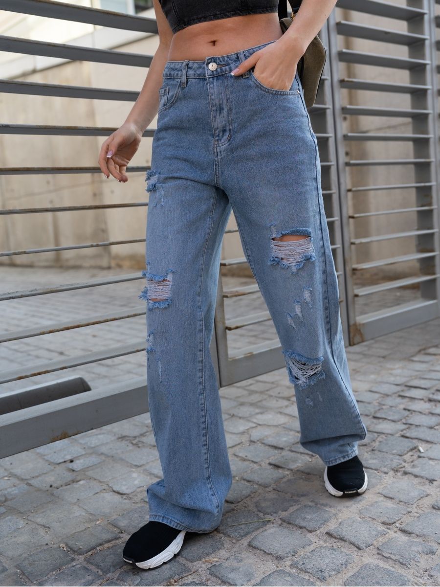 Описание: Джинсы рванные - модель с высокой посадкой, декорированная дырками, потертостями. Прямые, широкие от бедра джинсы с разрезами- актуальный тренд 2023 года. Однотонные демисезонные стильные джинсы женские универсальный предмет гардероба, подходящий для лета, весны. Возможность комбинировать различные стили как классические, так и офисные, поможет создать множество образов. Молодежные брюки с карманами по бокам будут органично сочетаться с лонгсливами, свитерами, толстовками, худи, блузами и футболками. Дополнить весенний лук помогут стильные аксессуары и обувь - кеды, ботинки на плоской подошве или каблуке, кроссовки, туфли. Завышенная талия и комфортная посадка акцентирует внимание на женственных очертаниях фигуры, корректируя визуально несовершенства. Двойная застежка в виде молнии и пуговицы позволяет модели плотно прилегать по бедрам. Универсальный крой с вырезами рассчитан на различные возрастные категории. Палаццо могут надеть подростки, молодые девушки, беременные женщины. Различные модели рассчитаны на худых и полных девушек. Джинсы трубы уникальны своим кроем, подходят для высоких и невысоких. Брюки клеш типа oversize - стильное решение для различных сфер жизни - в школу, для прогулки, романтического свидания, в офис, в дорогу. Свободные джеггинсы - практичный подарок для прекрасного пола на любые праздники. Их можно преподнести маме на день матери, дочери - на день рождения, бабушке - на Рождество, подруге, сестре - на Международный женский день. Скидки и распродажи позволят купить у нас красивые джинсы по выгодным ценам.
