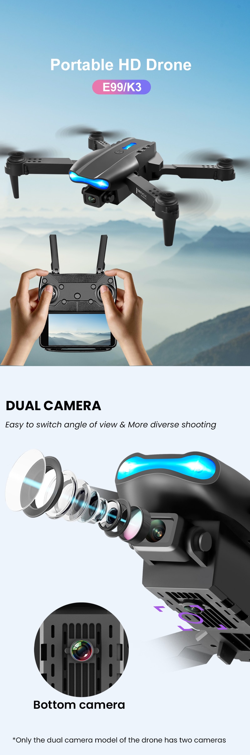 Переключение двойной камеры, функция фиксированной высоты, складной самолет, шесть пропусков с гироскопом; взлет одной кнопкой, посадка одной кнопкой, подъем и спуск, вперед и назад, левый и правый боковой полет, рулевое управление, режим без головы (с камерой можно добавить Функции: фотография жестов, видео, режим без головы, Аварийная остановка, Траектория полета, датчик силы тяжести, автоматическая фотосъемка)