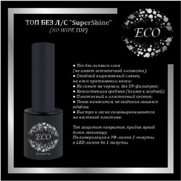 ECO, Суперглянцевый топ без липкого слоя, закрепитель для гель-лака (шеллак) 10мл