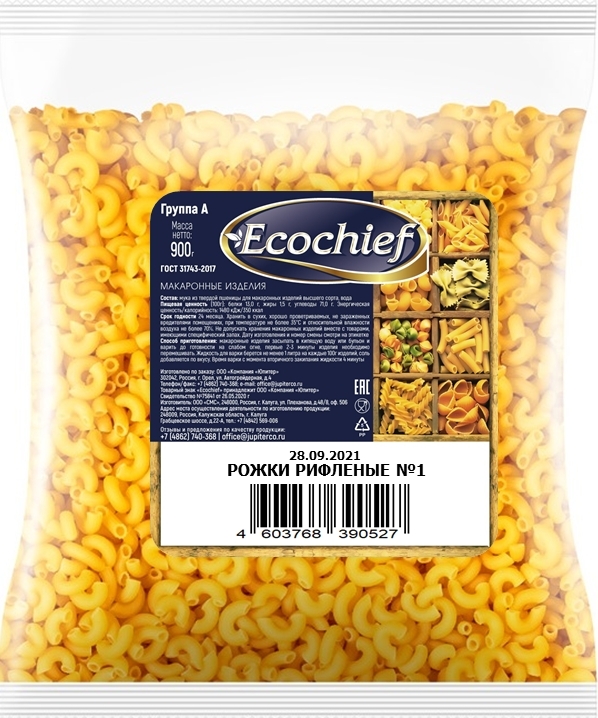 Ecochief Макаронные изделия Рожки Рифлёные №1, 900 г