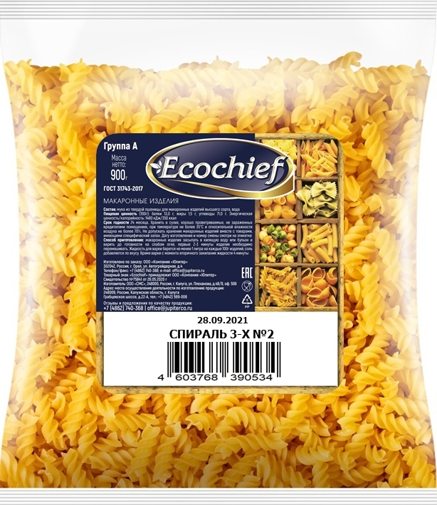 Ecochief Макаронные изделия Спираль №2, 900 г
