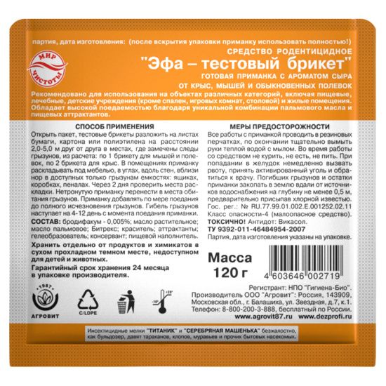 Описание: Средство ЭФА представляет собой готовую пищевую приманку в форме брикета зеленого цвета с ароматом сыра. Приманка обладает высокой поедаемостью благодаря введению в ее рецептуру уникальной комбинации пальмового и растительного масел с добавлением аттрактантов. Гибель грызунов наступает через 4-10 суток, хотя они могут получить смертельную дозу в течение 1-2 дней. Эфа тестовый брикет обладает высокой активностью в отношении: