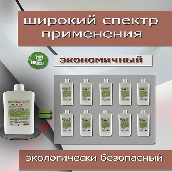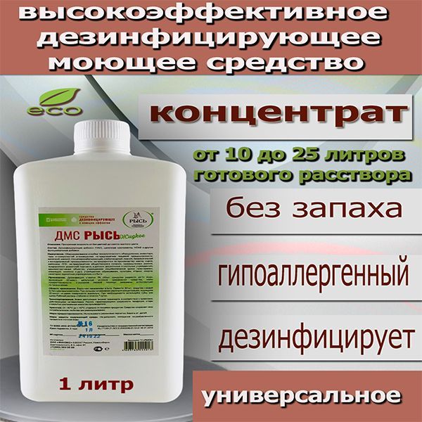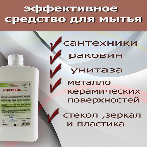 Больше нет необходимости хранить множество бутылок дорогостоящих средств , ведь есть одно - универсальное . Очищающее дезинфицирующее моющее средство ДМС РЫСЬ от сильных загрязнений. Это профессиональное эффективное , щелочное концентрированное, безопасное средство . Без хлора , без отдушек, без красителей , без фосфатов . Может применяться людьми с аллергией, так как , не имеет запаха . Подходит для уборки детских комнат . Безопасно для животных. Благодаря высокой степени концентрации средство очень экономично . Из 1 литра концентрата вы получите 10 бутылок рабочего раствора !!!!! Моющее ,чистящее средство может использоваться , как средство для чистки , мытья ,обезжиривания , удаление грязи и налёта с различных твёрдых поверхностей . Может использоваться , как антижир на кухне , для мытья плиты , раковин, нержавеющей стали , посуды , духовки , вытяжки, микроволновых печей , холодильника , кухонных поверхностей , для мытья кафеля , уборки в ванной , для мытья керамики , кранов , унитаза, санфаянса , душевых зон , мытья полов , линолеума , Пвх плитки, ламината , стен , окон , стёкол , пластиковых поверхностей , для мытья пола , ДМС РЫСЬ способствует устранению неприятных запахов. И дезинфицирует . Подходит для мытья кошачьих туалетов .