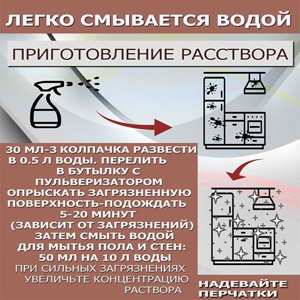 ◦ 30 мл концентрата разведите в 0.5 литра воды . Обработайте поверхность на 5-20 минут не давая средству полностью высохнуть . Затем смойте чистой водой . При сильных загрязнениях используйте губку .