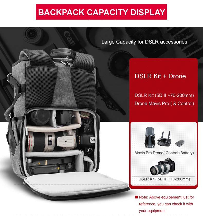 Capacity 1 x DSLR + 5 x Lens + Tripod + Accessories