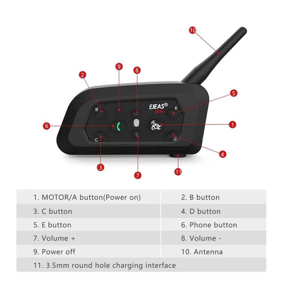 EJEAS V6 PRO Мотоциклетный Bluetooth-шлем Домофонная гарнитура с 1200 м BT Домофонный коммуникатор для 6 всадников Водонепроницаемый