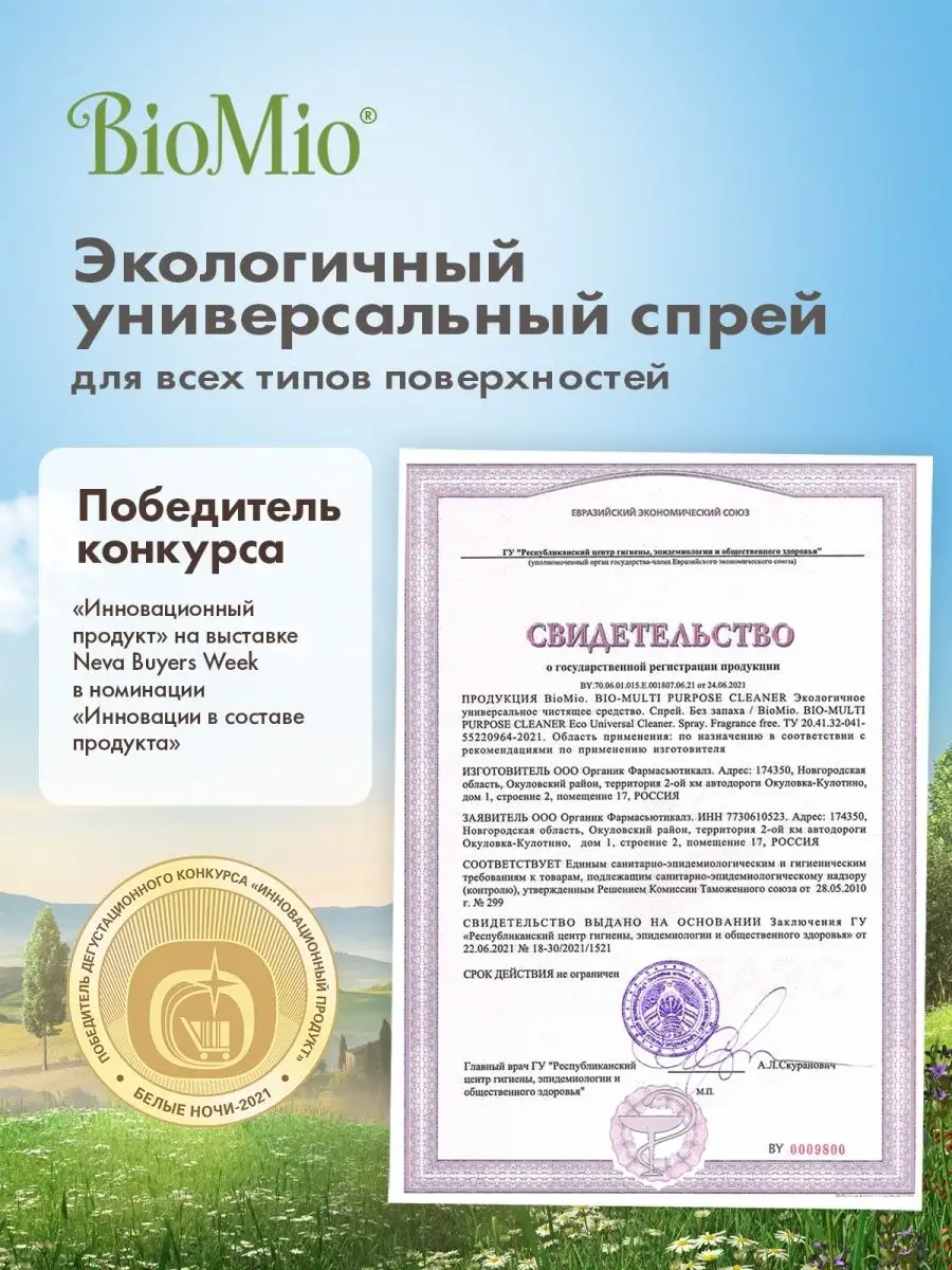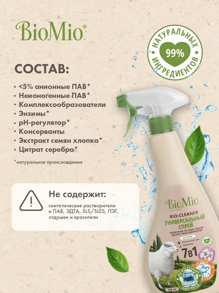 Описание: Экологичное универсальное чистящее средство BIO - MULTI PURPOSE CLEANER. Бережно очищает деревянные, керамические, стеклокерамические, эмалированные, пластиковые, стеклянные и стальные поверхности. Эффективно удаляет бытовые загрязнения, в том числе пригоревший жир и известковый налет. Легко смывается, не оставляя разводов. Содержит ионы серебра. Безопасно для планеты. Состав: анионные ПАВ (натуральное происхождение), неионогенные ПАВ (натуральное происхождение), комплексообразователи, энзимы (натуральное происхождение), рН-регулятор(натуральное происхождение), консерванты, экстракт семян хлопка, цитрат серебра(натуральное происхождение). Применение: нанесите небольшое количество средства на обрабатываемую поверхность или губку, протрите или при необходимости оставьте на несколько минут, затем смойте влажной тряпкой и вытрите насухо. При первом использовании протестируйте средство на незаметном участке, не прилагайте больших усилий при трении